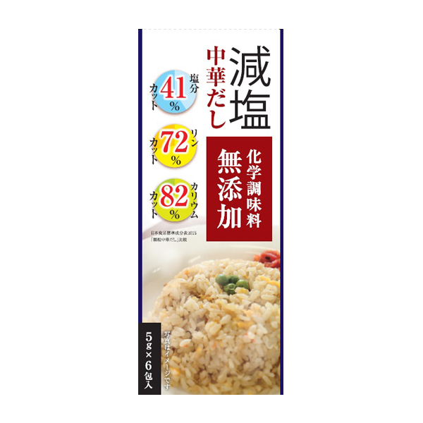 減塩中華だし 化学調味料無添加は、日本食品標準成分表2015「顆粒中華だし」と比べ“塩分41%カット・リン72%カット・カリウム82%カット”した中華だしの素です。