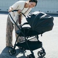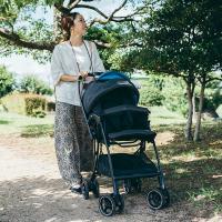 機能が増えると、重量が重くなるA形ベビーカー。平均6〜10kgと言われるA形ベビーカーの中、座面のスプリングや、大きなフードがありながらも、5.3kgの軽量化を実現しました。赤ちゃんの腰が座り、体重が増えた頃、抱っこをしながらベビーカーを持ち運ぶことがあるでしょう。体感1秒たらずのワンアクションで畳めて、身軽に持ち運べるのは重要なポイントです。さらに驚くのは、畳んだ後の安定感。何も支えずともしっかりと自立して綺麗に折りたたまれます。玄関だけでなく、レストランや店先で預ける時にも気兼ねなく畳んで置けます。