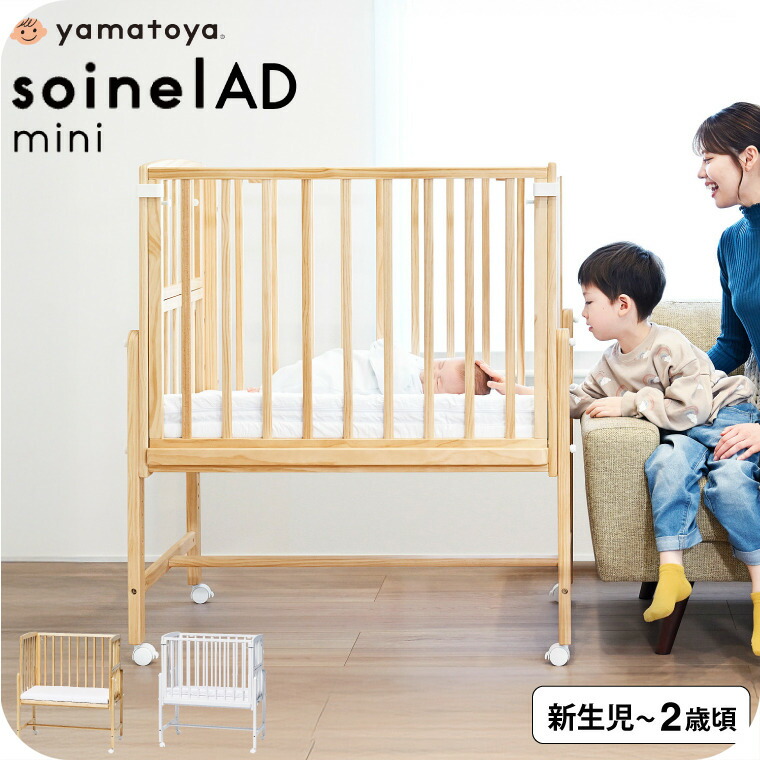 親子が一緒に寝られるわずかな期間をより素敵な時間にして欲しい。お子様は、ママのにおい、寝息を感じて安心して眠る。ママは、お子様の寝顔を見ながら癒される。そんな添い寝ができるベビーベッド。大人のベッドの高さと合わせ、段差なくつなげて使用可能。段差も20段階から28段階とより細やかな高さ調整が可能となりました。マットレスを外した状態で、大人のベッドにベルトを取り付け固定します。カラビナで脱着可能なので、取り付け、取り外しもスムーズです。キャスターを付ければ、家の中の移動も簡単。側面には小さなトビラを標準装備。安全かつ簡単な開閉式でおむつ替えも楽々です。前トビラは取り付けしやすいようにホゾを大きくし、収納できるフックを背面に設置。横枠上部をカーブさせより柔らかな雰囲気に。専用マットレス付き。専用工具付きで(六角レンチ・スパナ)部品も少なく簡単に組み立てられます。本体はナチュラルとホワイトの2色展開。そいねーるのベビーベッドは、日本では国の「特別特定製品」に認定されており、検査を合格した商品のみ、PSC・SGマークをつけて販売することができます。
