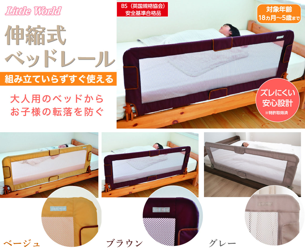 大人用のベッドからお子様の転落を防ぐロングサイズで組み立ていらずの伸縮式ベッドレール