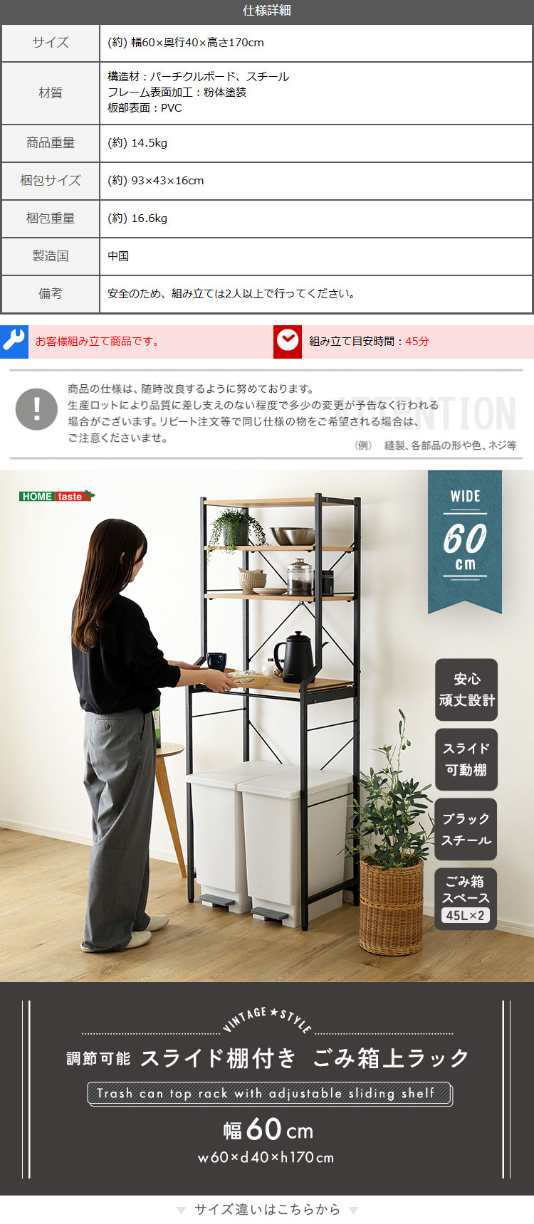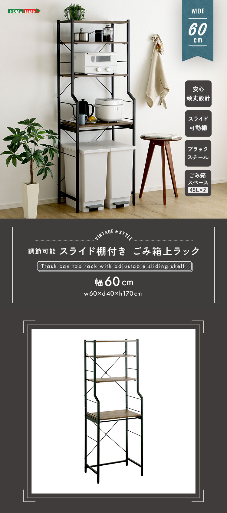 高さ調節可能なスライド棚付きなので、お持ちのキッチン周りの家電やごみ箱のサイズに合わせて使えます!