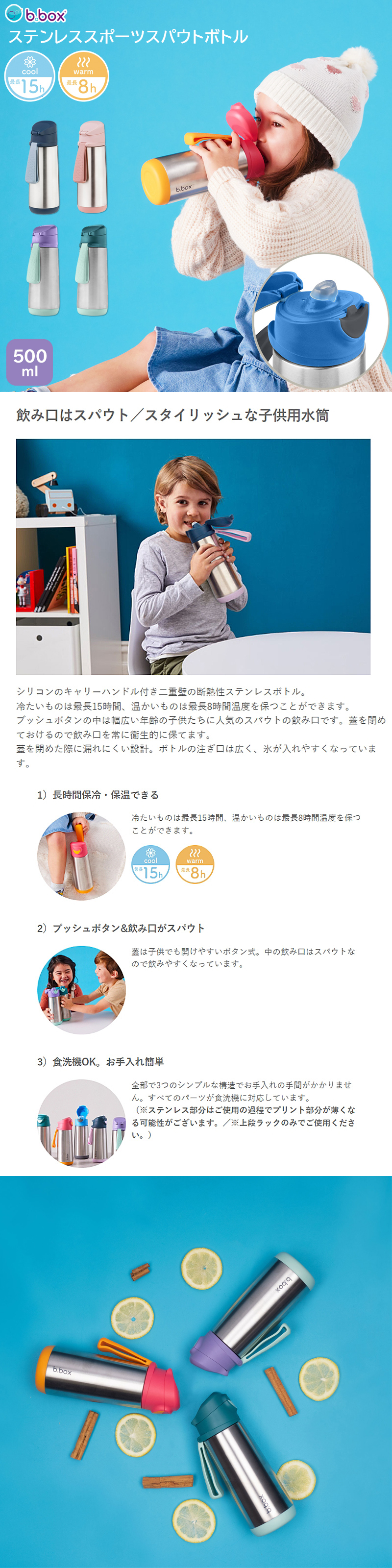 | 説明 | ・長時間保冷、保温できる 冷たいものは最長15時間、温かいはものは最長8時間温度を保つことができます。 ・プッシュボタン&飲み口がスパウト 蓋は子供でも開けやすいボタン式。中の飲み口はスパウトなので飲みやすくなっています。 ・食洗機OK。お手入れ簡単 全部で3つのシンプルな構造でお手入れの手間がかかりません。すべてのパーツが食洗機に対応しています。 (※ステンレス部分はご使用の過程でプリント部分が薄くなる可能性がございます。/※上段ラックのみでご使用ください。) |