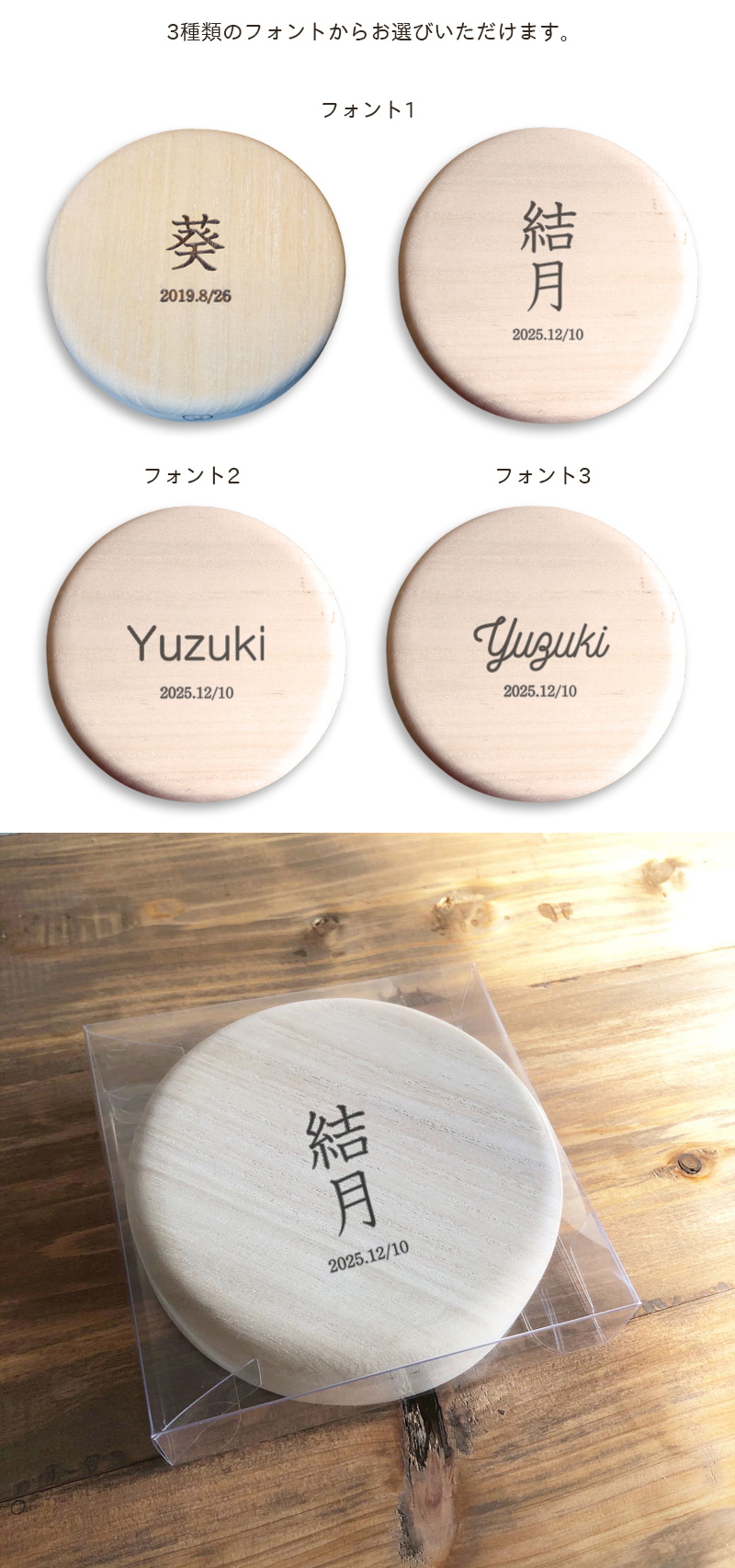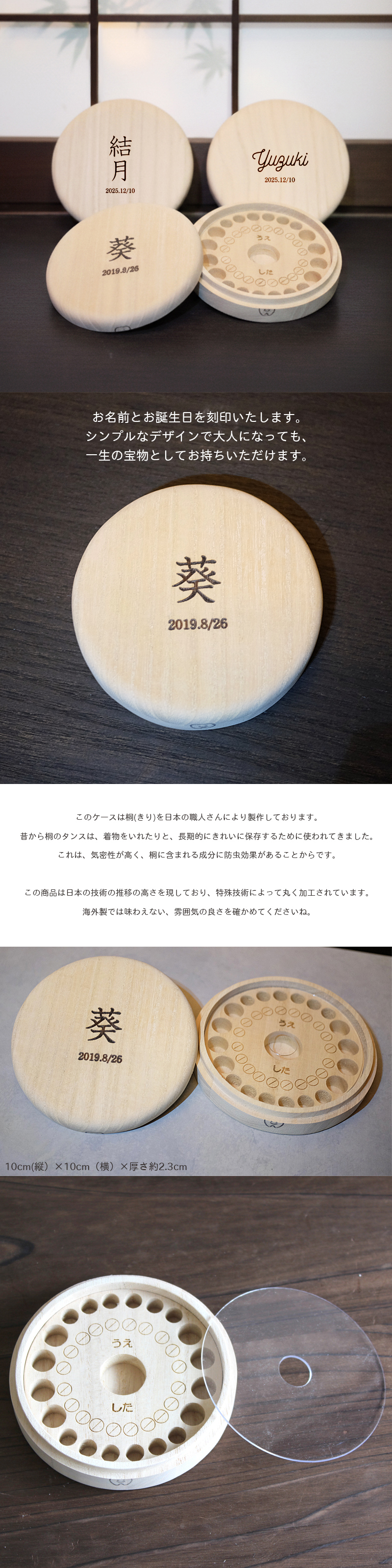 | 注意事項 | ・お客様の環境により色味が異なる場合がございますので予めご了承ください。 ・桐の特性として、調湿作用があり湿気に強いのですが、季節により、 微妙にサイズや状態が違い、変色したり、乳歯ケースの蓋が硬くなったりします。 ・天然素材の為、木目や刻印の風合いに個体差がございます。 |