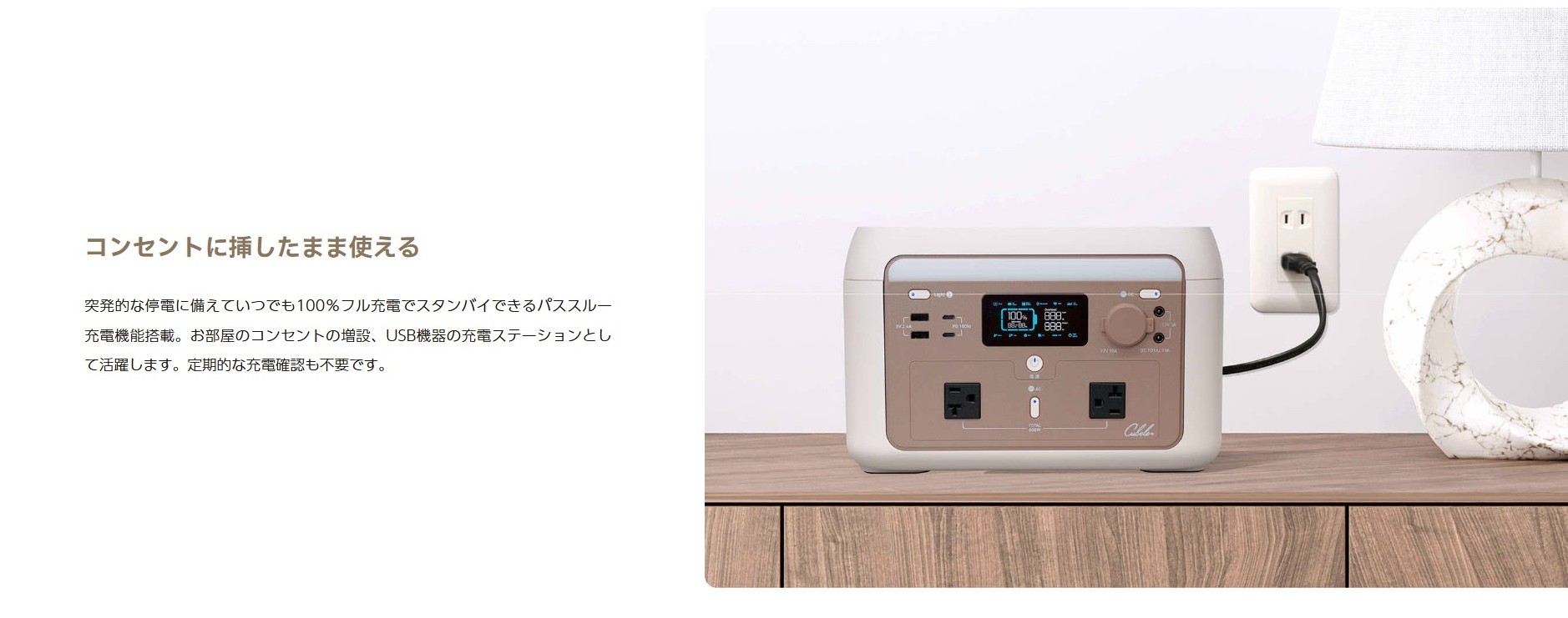 突発的な停電に備えていつでも100%フル充電でスタンバイできるパススルー充電機能搭載。お部屋のコンセントの増設、USB機器の充電ステーションとして活躍します。定期的な充電確認も不要です。