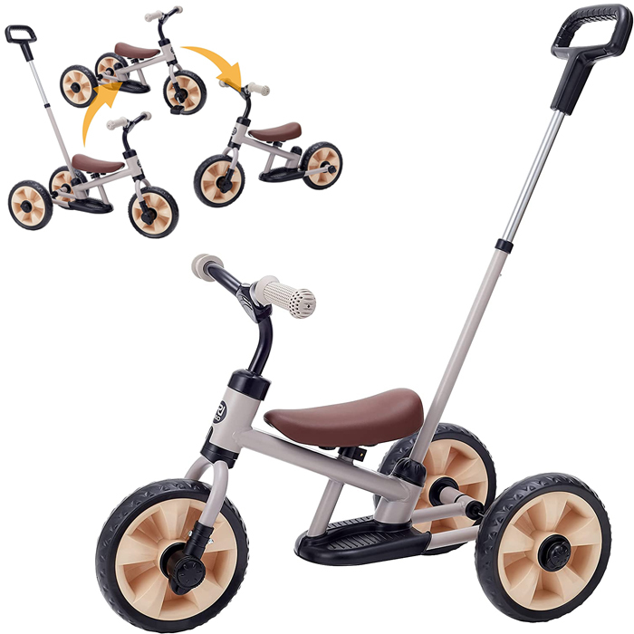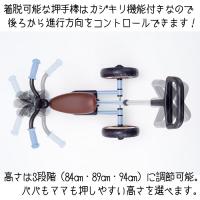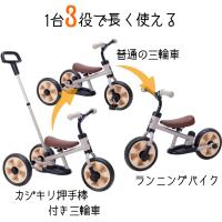 - カジキリ機能付き押手棒を装着し、保護者の方とのお散歩に。自分でこげるようになれば、押手棒をはずして普通の三輪車として。さらに、ペダルと後輪をひとつ外してランニングバイク形態にも。