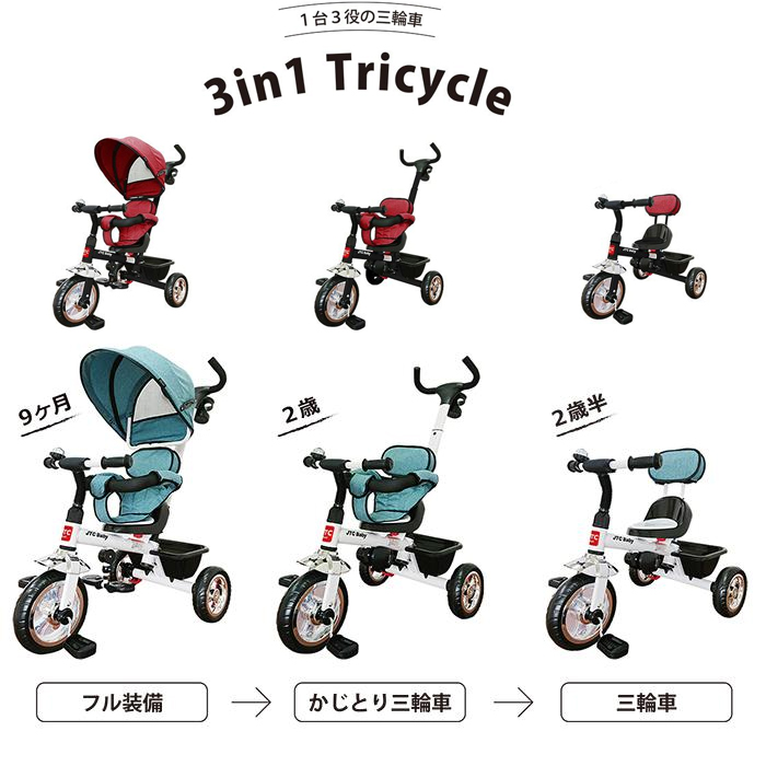 3in1 Tricycle 三輪車 手押し棒 かじきり 舵取り サンシェード 子供 子供用 乗用 乗り物 手押し かじとり シンプル ノンキャラ JTC