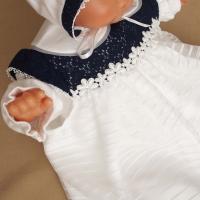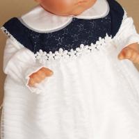 ロング丈のーコートが豪華な雰囲気のお宮参りセレモニー用ベビードレス。当店の取り扱い商品は全て生地縫製ともに高品質な日本製。総丈65センチの豪華ロングコートのベビードレスセットです。お帽子・ロングコートドレス・インナーのツーウェイオール(綿100%)の3点セットになります。ご出産祝いギフトなどにもおすすめ。ツーウェイオールは夏物:天竺 春秋物:スムース をお選びいただけます 胸元の紺色のヨーク部分や花モチーフが、大切なセレモニーで豪華な雰囲気を演出してくれます。ロングコートが写真映えするデザインです。生地縫製ともに高品質な日本製 送料・代引き手数料は全国無料!
