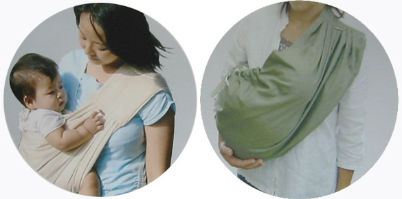 | *横抱っこで使用する場合、左肩にかける場合、赤ちゃんの足はお母さんの左手側に(右の画像参照)、 右肩にかける場合、赤ちゃんの足はお母さんの右手側にして使用することもできます。 | ![]() |