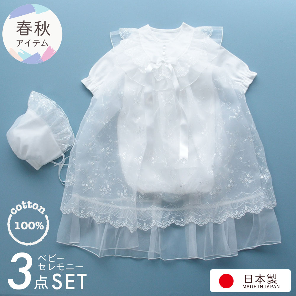 ロングコート・ツーウェイオール(夏物天竺素材)・お帽子の3点セット(ギフトボックス入り)。 お宮参りなどの晴れの舞台で映える豪華なデザイン! コート丈が70センチと長めのデザインで更に2段になっているので、ふんわりと豪華な雰囲気で広がりますよ。 胸元ヨーク部分の大きなフリルや光沢のあるリボンが、大切なセレモニーで豪華な雰囲気を演出してくれます。 コートはノースリーブになっており、背中部に着脱用のボタンが2つございます。 お帽子もオーガンジーで2重になっているため、豪華な雰囲気で型くずれしにくいデザインです。 無地のツーウェイオールはシンプルなデザイン 股部分のスナップボタンの付け方を変えると、カバーオールにもなる便利なツーウェイタイプ。 | | サイズ | 50センチから70センチ(体重3キロから9キロ) | | 実寸 | ツーウェイオール総丈 50センチ コート丈 70センチ | | 着用期間 | 新生児から6ヶ月を目安にお考えください | | 品質 | 綿100% オーガンジー部分:ポリエステル100% | | 生産国 | 国内のベビー用品専門工場で生産されている安心安全の日本製 | | 配送方法 | 宅配便でお届け。送料無料 | |