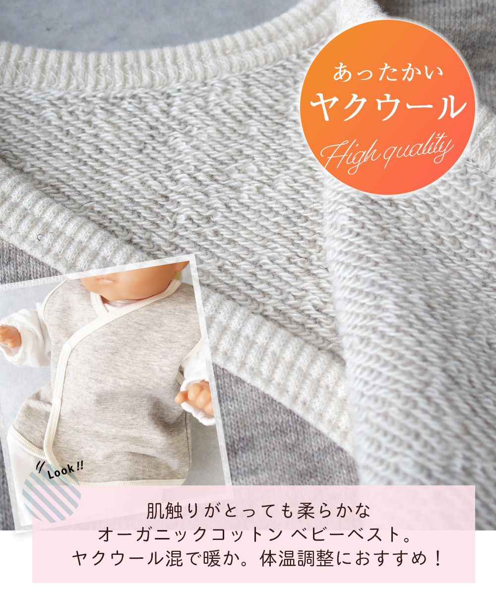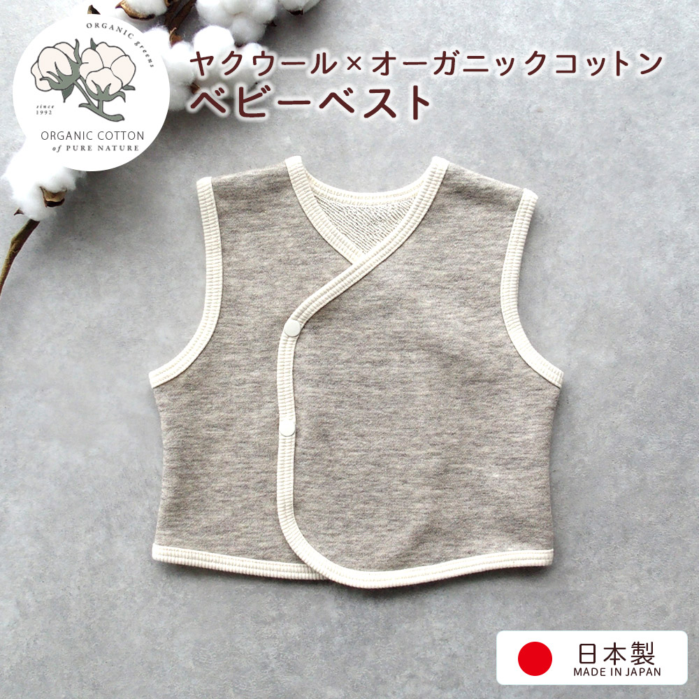 日本製赤ちゃんの体温調節におすすめのベビーベスト。ヤクウールとオーガニックコットン素材で、冬も暖か。合わせるお洋服を選ばないシンプルなベストなので、出産祝いなどにもおすすめです♪14時までのご注文は即日発送可能!