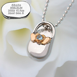 | | 意匠登録 〓 登録第1255027号 | お誕生の記念に・・・。 わが子の幸せを願って、「幸せを運ぶ」といわれている「銀の靴のペンダント」はいかがですか? ベビー&ママの絆を形に。。。1歳のお誕生の記念にベビーシューをどうぞ。 妻から母へ・・・。 赤ちゃんの誕生は、母親の誕生でもあります。 がんばったお母さんにメモリアルなプレゼントを送りましょう♪ お二人の記念日に・・・。 お誕生日、ご結婚、出会いの日、告白したあの日・・・ お二人の記念日に。 フェミニンな胸元を演出。 可愛らしい胸元を演出するペンダントとして。 ご自身へのご褒美や、クリスマス・ホワイトデーなどの プレゼントにも最適です。 |  | | ☆Baby's Shoe Original KT-22 チェーン付き 13,000円(税別) | サイズ ●トップ:約縦11×横7×高さ6mm ●チェーン:約40cm ボールチェーン ●誕生石:約直径1.5mm | 素材 ●トップ:シルバー(925)、K18ピンクゴールド、天然石 ●チェーン:シルバー(925) | | |