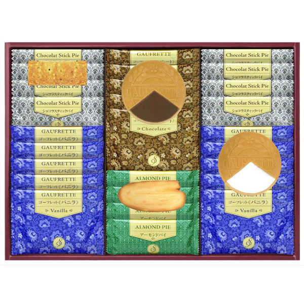 ●ゴーフレット(チョコ×5、バニラ×10)、アーモンドパイ×4、ショコラスティックパイ×8●箱27.5×37.5×4.0cm(日本製)●賞味期限/180日(製造日より)※(H)おまかせ包装は当社指定の包装紙にてお包みいたします。●ご用途例:快気内祝い 新築内祝い 内祝い 出産内祝い 節句 七五三