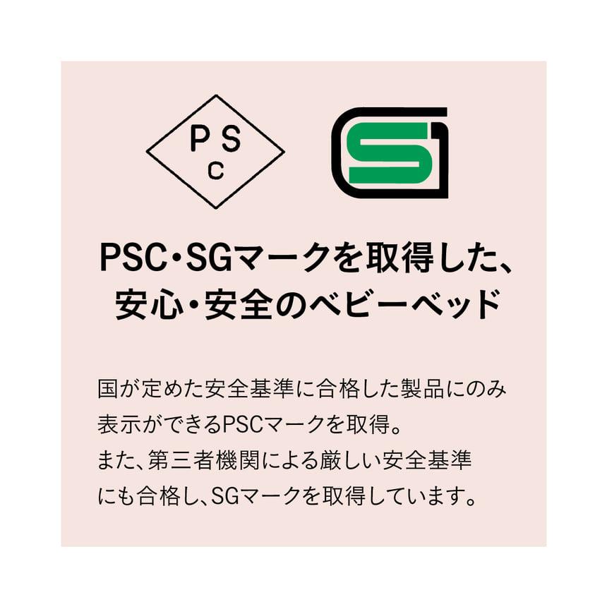 ・トモネルは、国が定めた安全基準に合格した製品にのみ表示ができるPSCマークを取得。また、第三者機関により厳しい安全基準にも合格し、SGマークを取得している安心・安全のベビーベッドです。