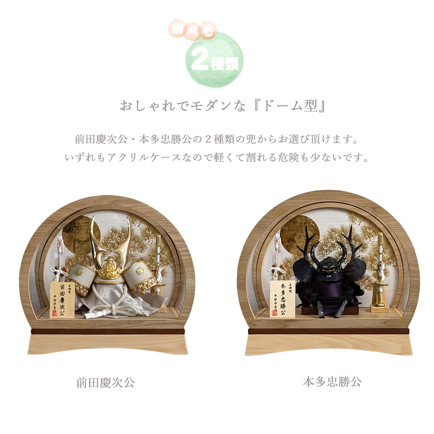 五月人形 前田慶次 本多忠勝 選べる兜 ケース飾り 兜飾り ドーム型 丸形 アクリルケース 端午の節句 コンパクト 簡単
