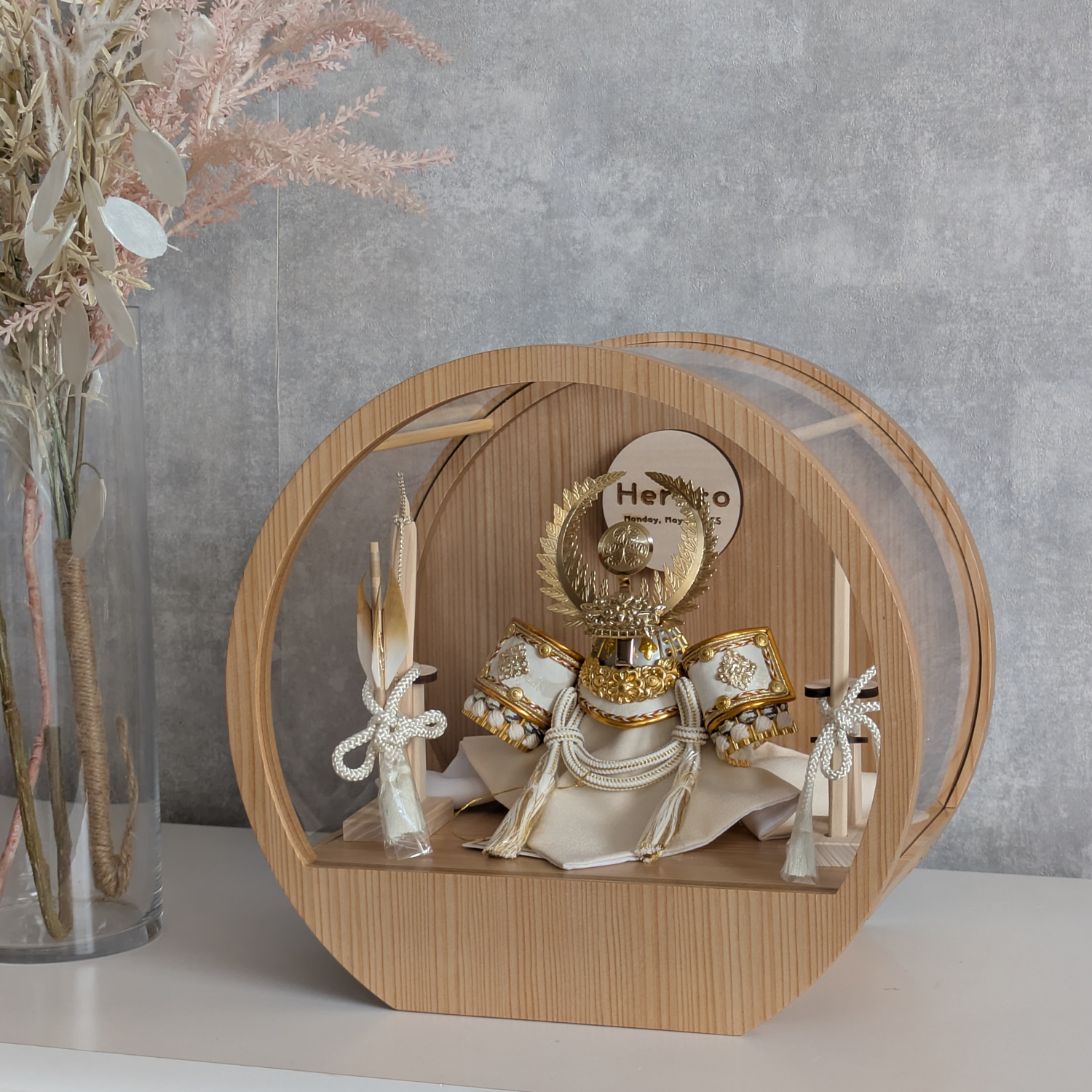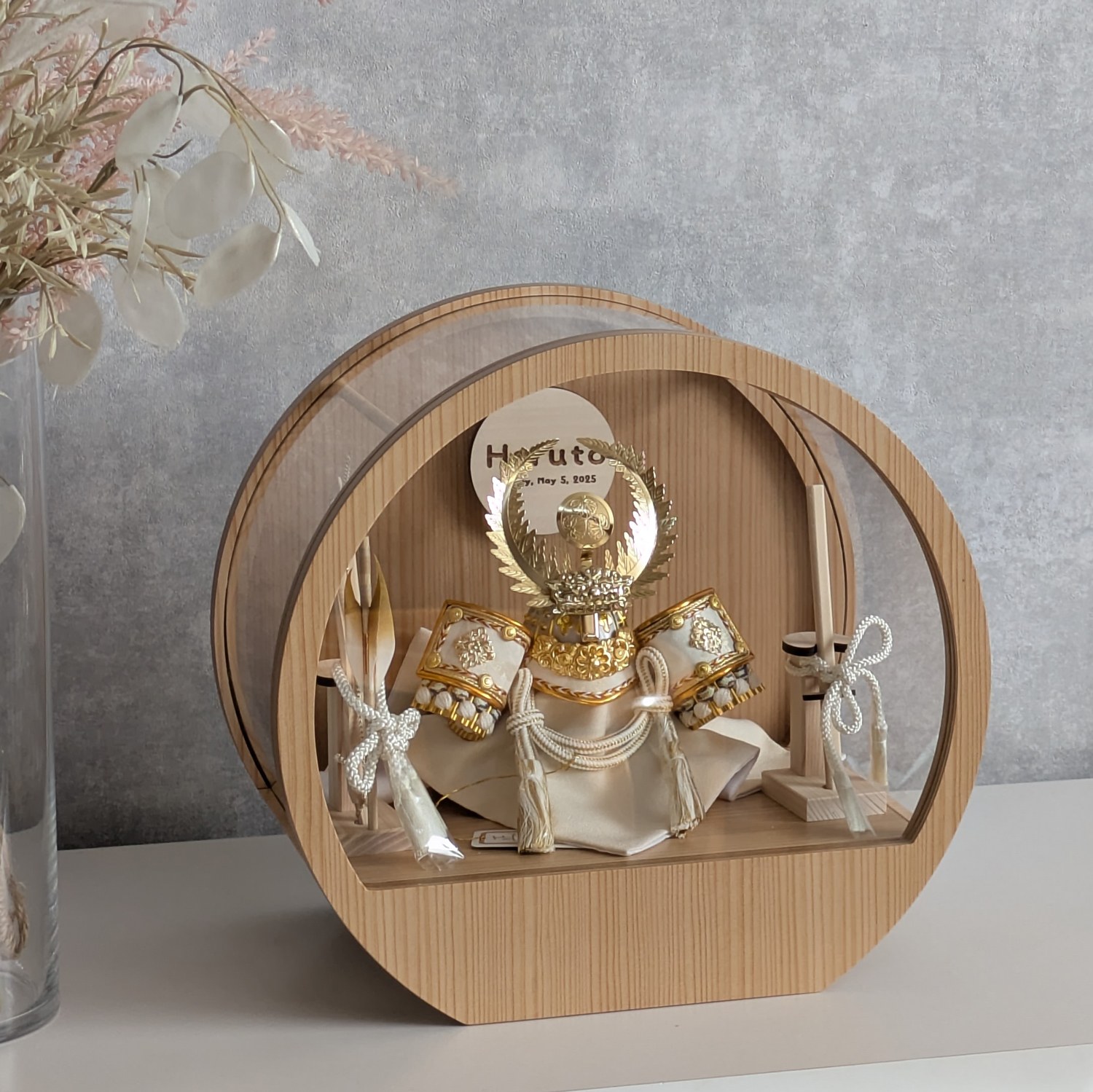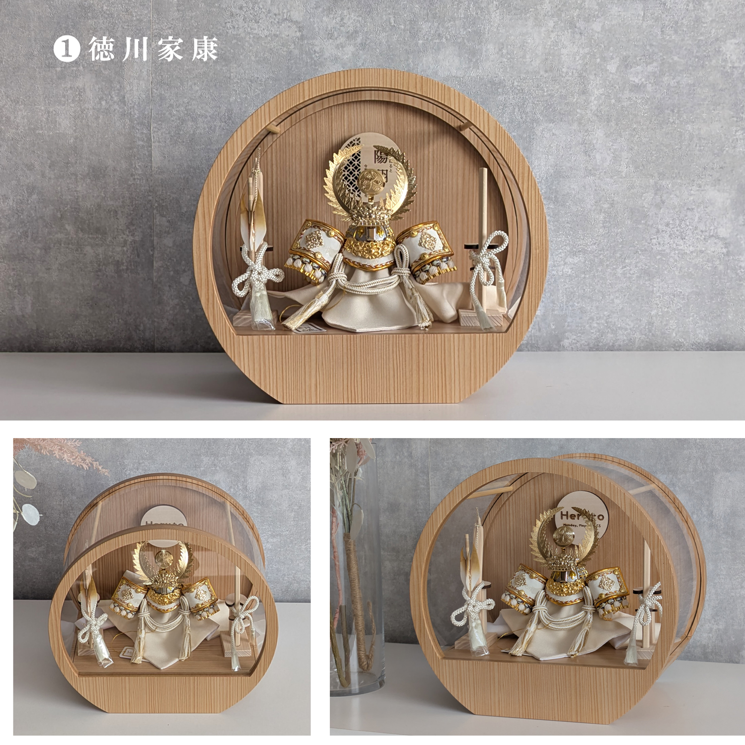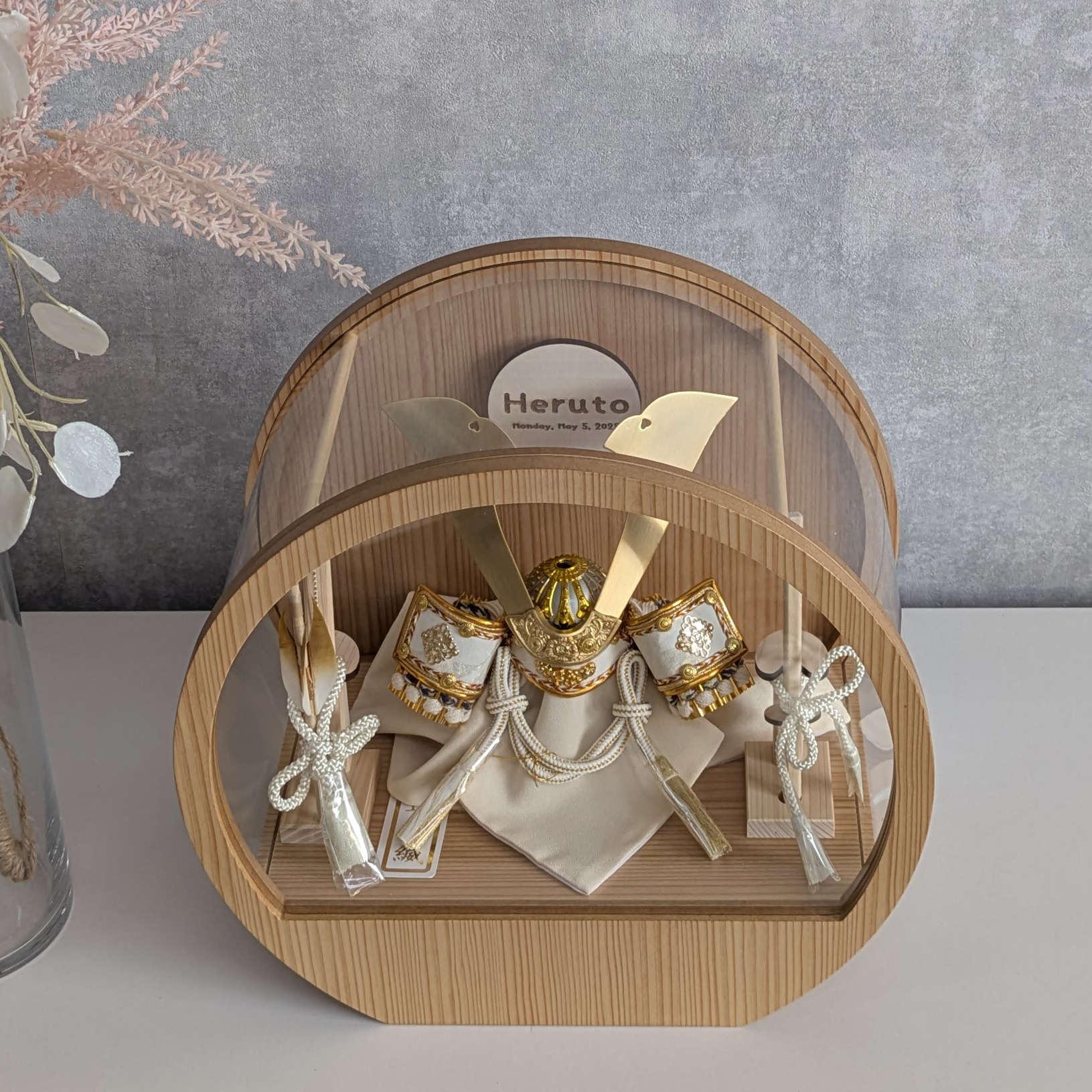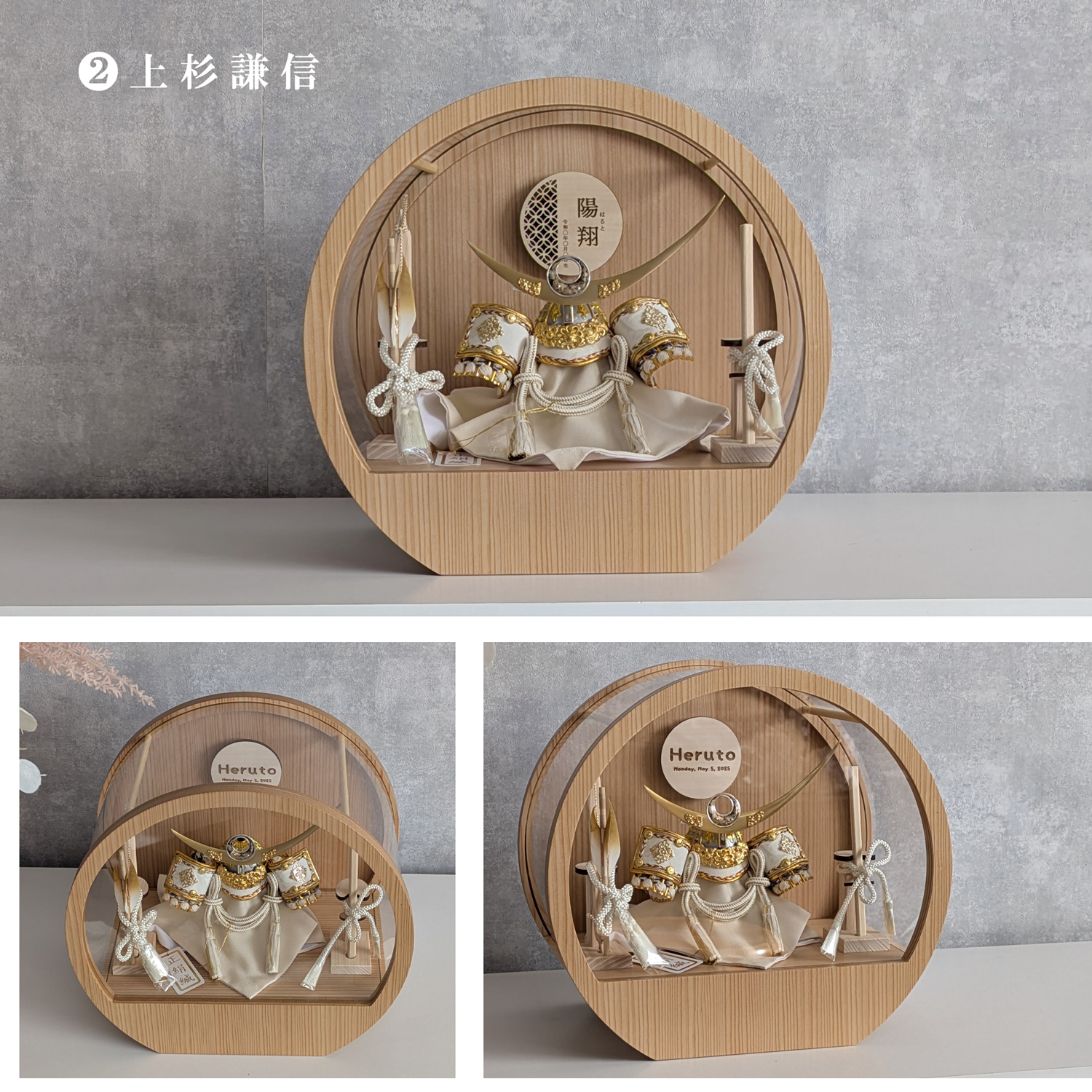 五月人形 名入れプレート付き 徳川家康 上杉謙信 大鍬形 コンパクト アクリルケース 飾れるケース飾り 兜飾り ケース飾り 間口30cm ドーム型 丸型
