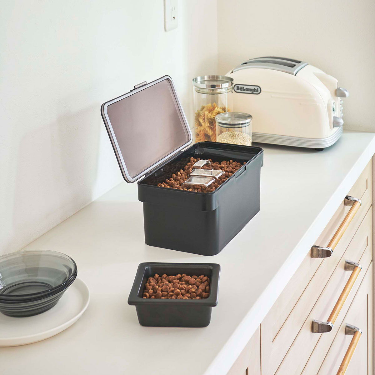 リビングやキッチンにそのまま置けるスタイリッシュなペットフード保存容器、TOWER 密閉ペットフードストッカー 1.5kg 軽量カップ付き。蓋をパチッとロックしておけば、湿気・酸化・臭い漏れを防いでくれる優れもの。180mlまで測れる計量カップ付きでお届けします。