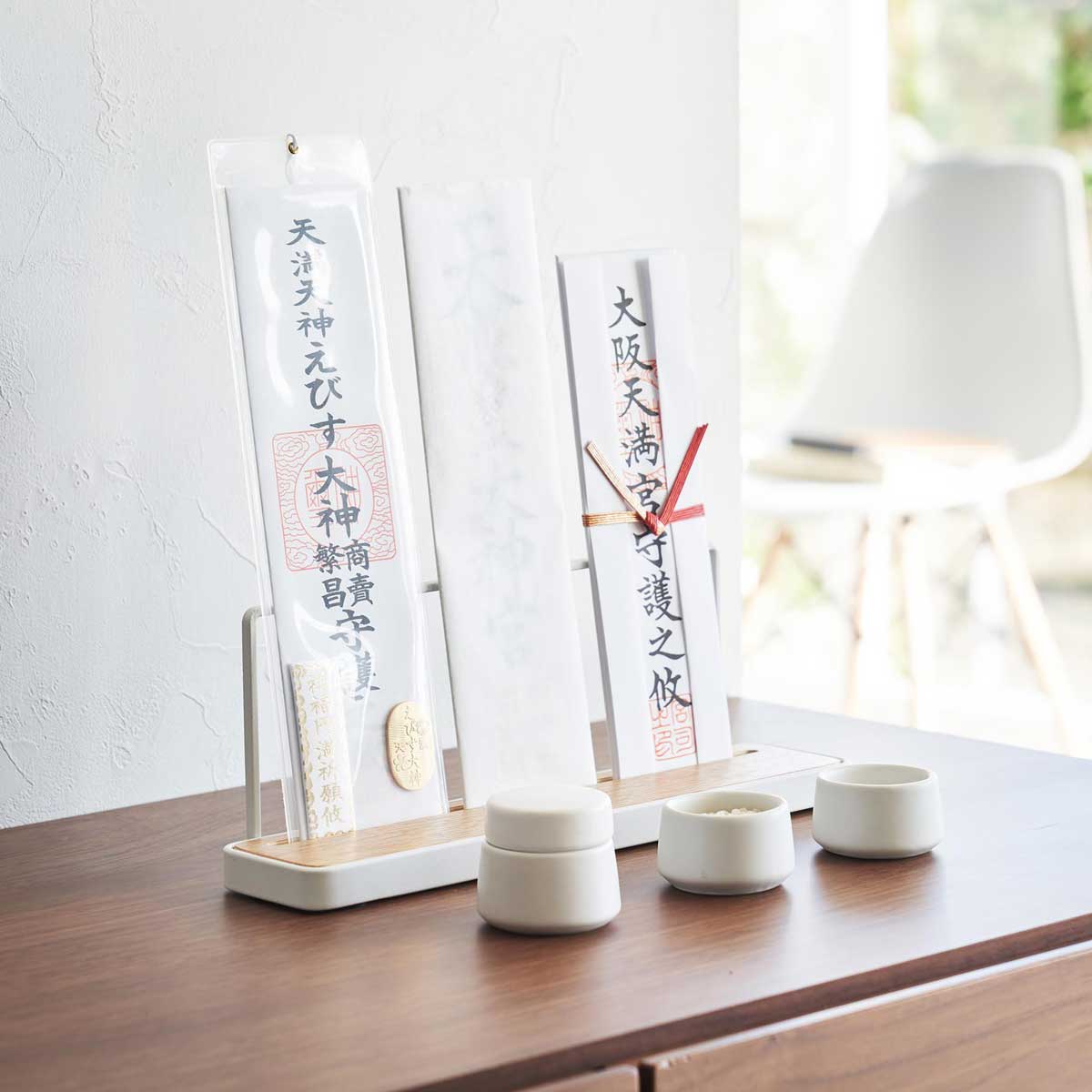 モダンな神具3点セット!本格的な神棚からモダンな神棚までどちらにも合うシンプルなデザインの神具セットです。マットな質感が上品な雰囲気を演出し、お手持ちの神棚や神札立てにも調和します。水玉1個と皿2枚のセットで、水玉には蓋が付属しています。