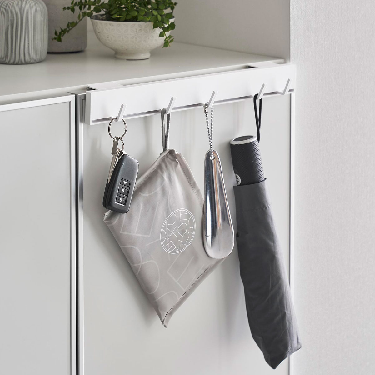 玄関の整理整頓に最適なtower 引っ掛け可動式下駄箱扉フック。靴べら、レインコート、折り畳み傘など、よく使うアイテムを簡単に収納できます。5連の可動式フックは物の幅に合わせてスライド可能で、玄関周りを快適で使いやすくします。約1.4〜2cmの厚さの扉にも対応し、付属の木ネジで壁に付けても使用できます。