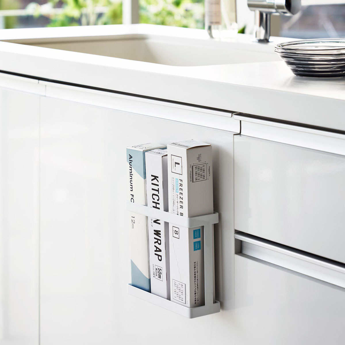 人気ブランドtowerより、フィルムフックで浮かせて収納できるラップホルダーです。仕切り付きのホルダーでラップを安定して収納できます。ホルダー奥に隙間があるので、仕切りを気にせずちょっとしたものも収納可能です。