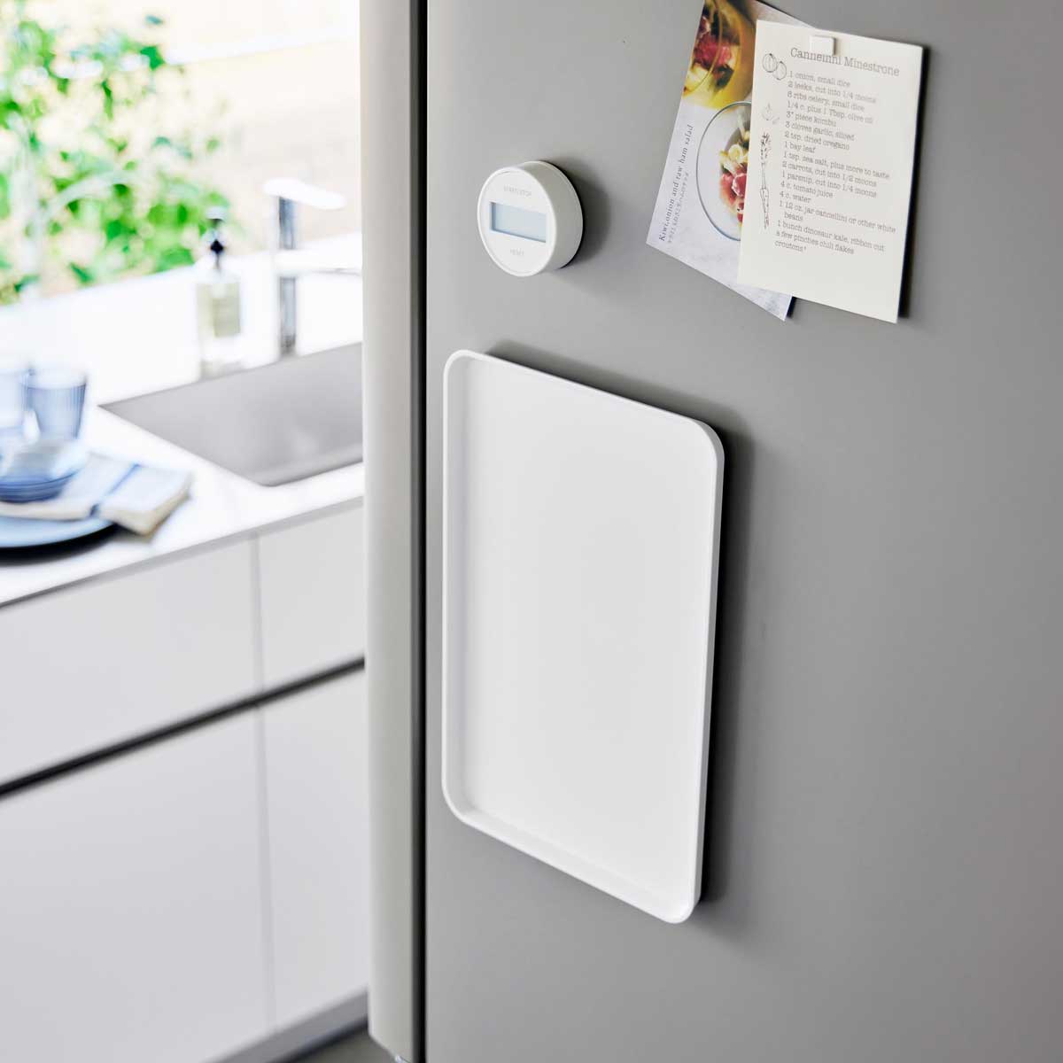 使いたい時にサッと使える!マグネットで冷蔵庫横に収納できるトレーです。収納に困るトレーを冷蔵庫やキッチンパネル、ウォーターサーバー横にマグネットで簡単に取り付けて収納できます。使用したい時にサッと使えて便利。