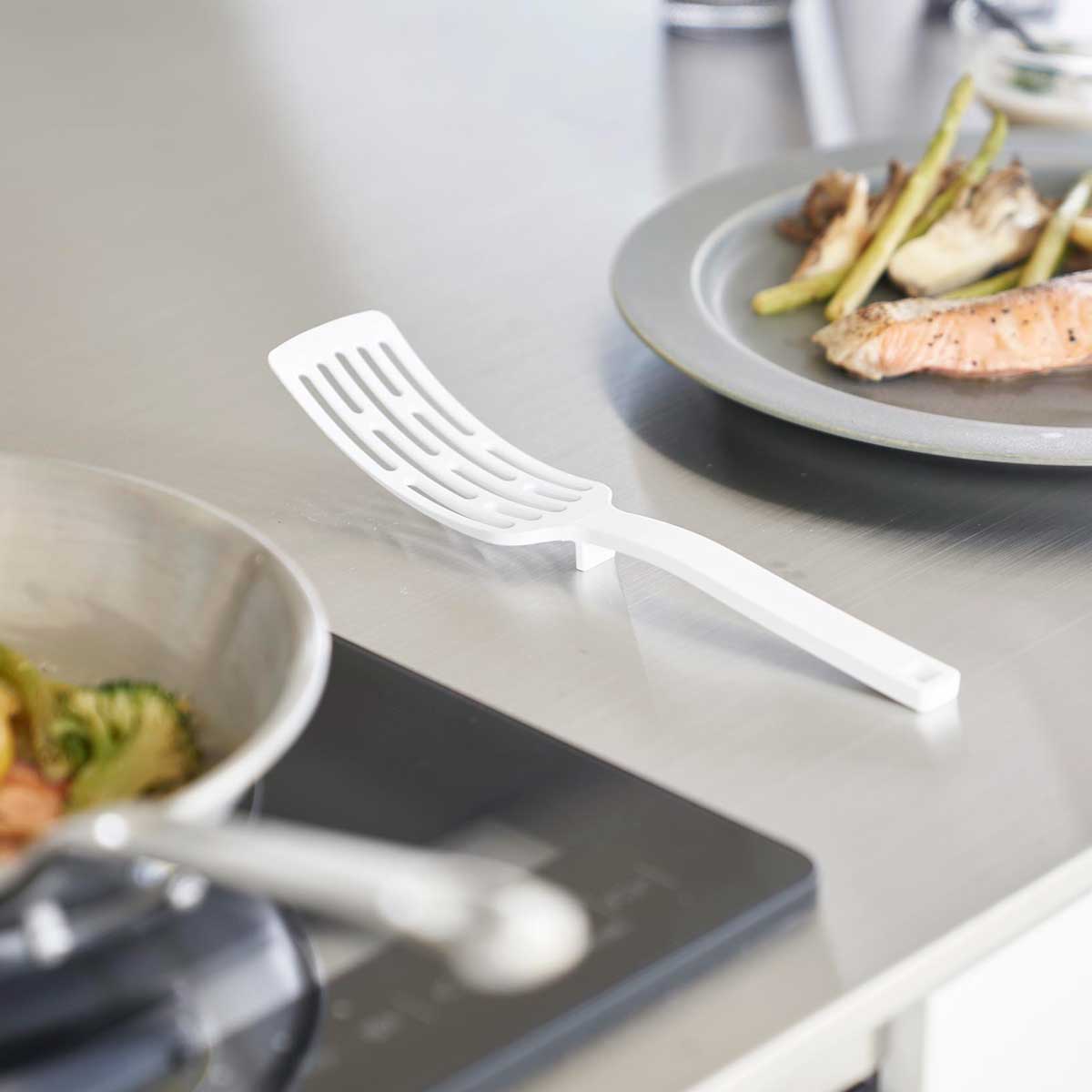 コンパクトサイズのターナーです。ヘラの部分に長い物を乗せやすいロングサイズで、しなやかに曲がりフライパンと食材の間に入りやすく、長い物も形を保ったままひっくり返せます。
