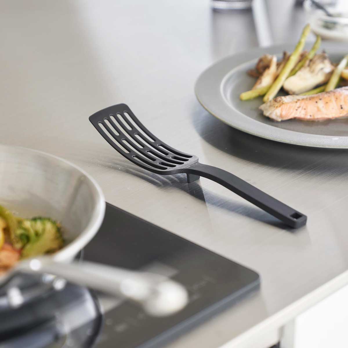 ヘラ部分が長くて返しやすい!コンパクトサイズのターナーです。ヘラの部分に長い物を乗せやすいロングサイズで、しなやかに曲がりフライパンと食材の間に入りやすく、長い物も形を保ったままひっくり返せます。