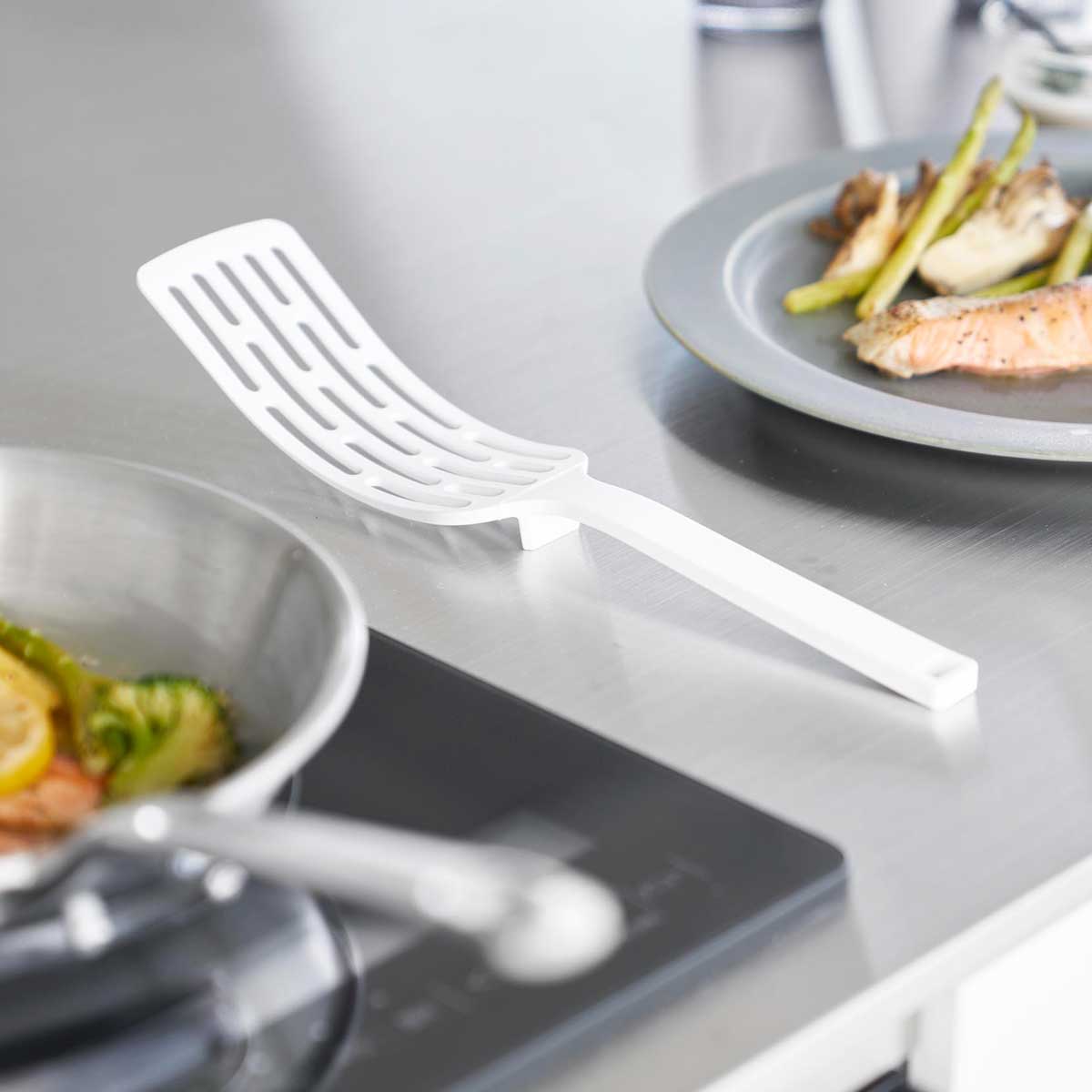 ヘラの部分に長い物を乗せやすいロングサイズのターナーです。しなやかに曲がりフライパンと食材の間に入りやすく、長い物も形を保ったままひっくり返せます。