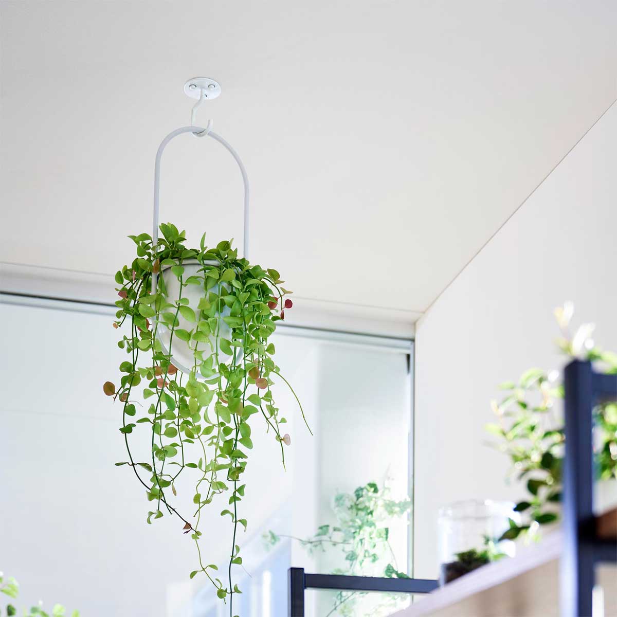 石こうボードピンで取り付けできるプランターフックです。天井に付属の石こうボードピンでフックを取り付け、観葉植物を吊るして飾れます。モビールの吊り下げにもおすすめです。