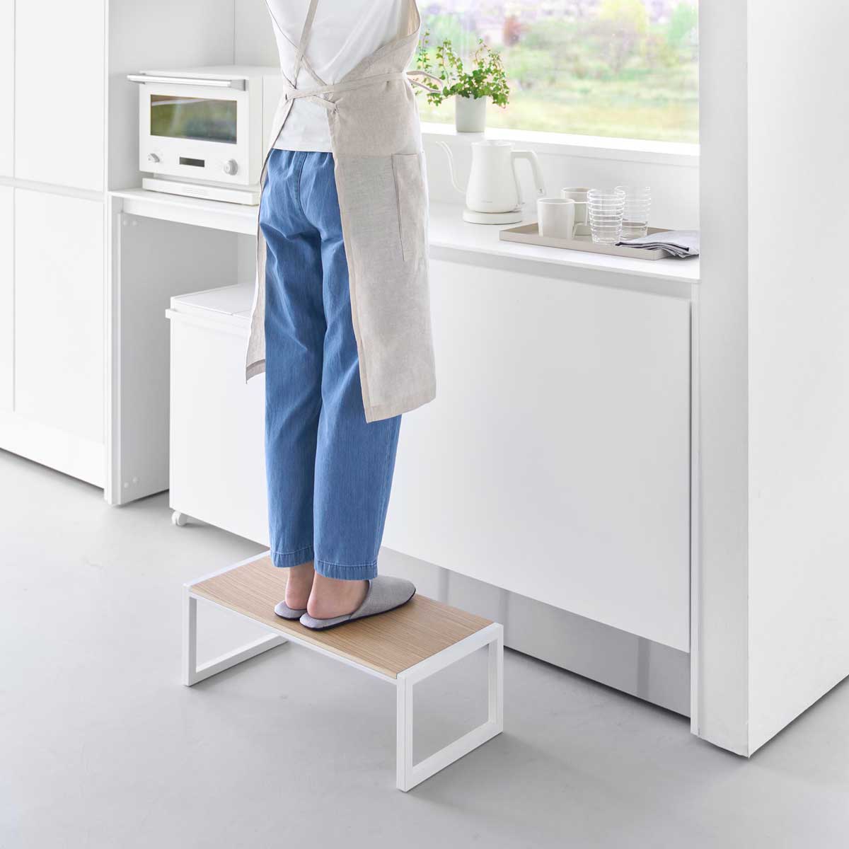 エントランスでは玄関のたたきに置いて昇降のサポートにも使え、天板下はシューズの収納スペースとして有効活用できます。天板の幅が広いので高い場所に収納した物を取り出す際も安心です。
