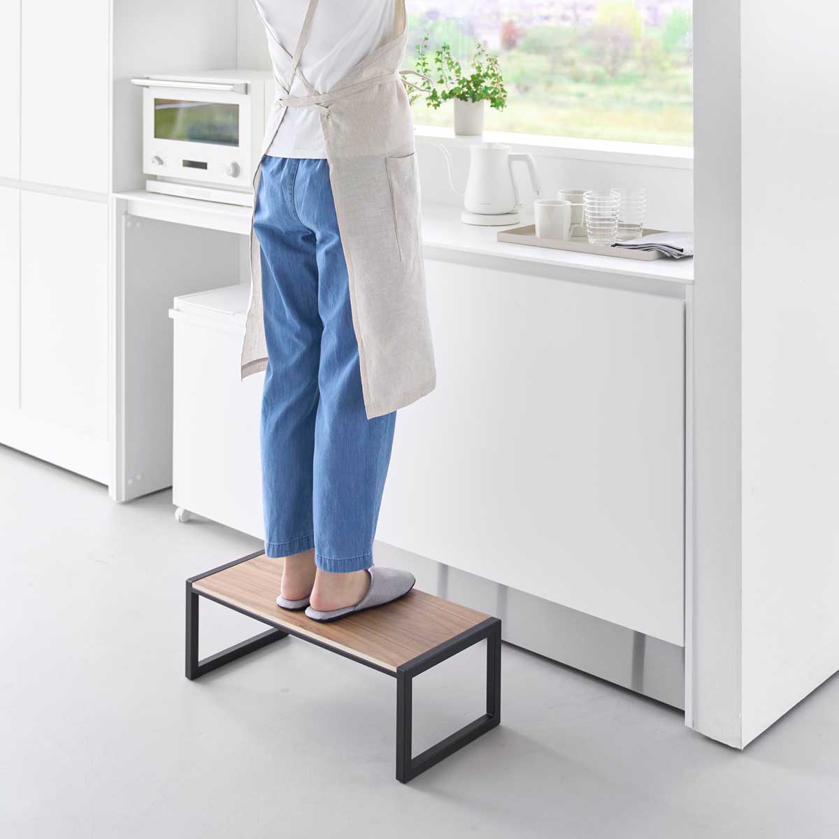 エントランスでは玄関のたたきに置いて昇降のサポートにも使え、天板下はシューズの収納スペースとして有効活用できます。天板の幅が広いので高い場所に収納した物を取り出す際も安心です。