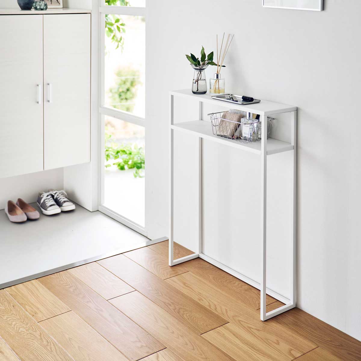 エントランスや廊下、リビングで活躍する棚付きのコンソールテーブルです。眼鏡や鍵などのちょい置きや観葉植物やディフューザーなどディスプレイに便利に使えます。