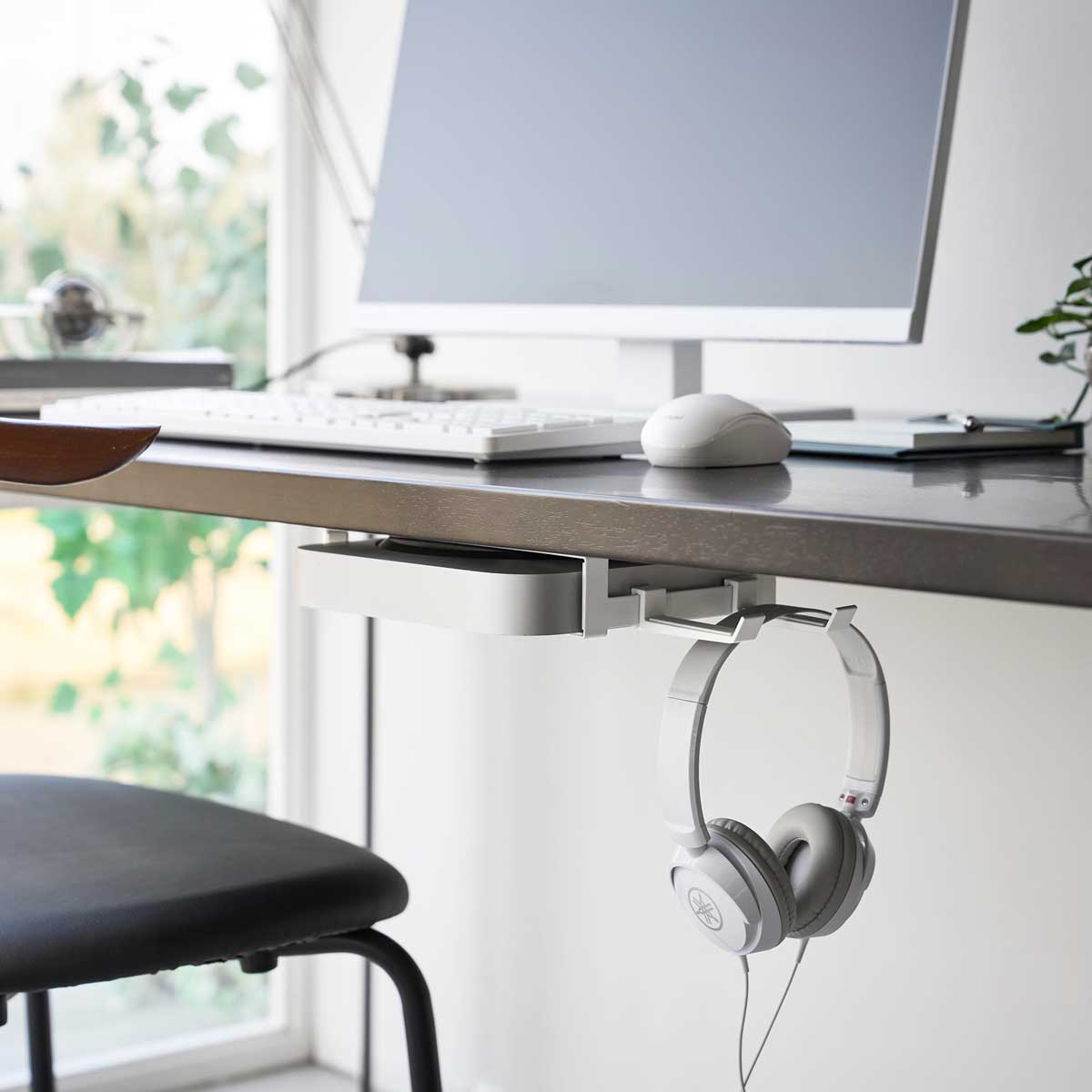 壁面には、穴が目立ちにくい石こうボードピンで簡単に取り付けでき、デスク下には木ネジでしっかり固定可能。ラックを縦横どちらの向きに設置しても、取り付け可能なロングフックが2個付属しており、掃除道具やヘッドホンの収納に便利です。