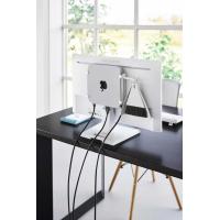 対応する小型PCをモニター背面やデスク下、壁面の3通りで収納できるラックです。モニター背面のVESA規格ネジ穴に対応し、スリット穴によりモニターの支柱や配線を避けて取り付けることができます。ラックはMac mini M2に対応しています。