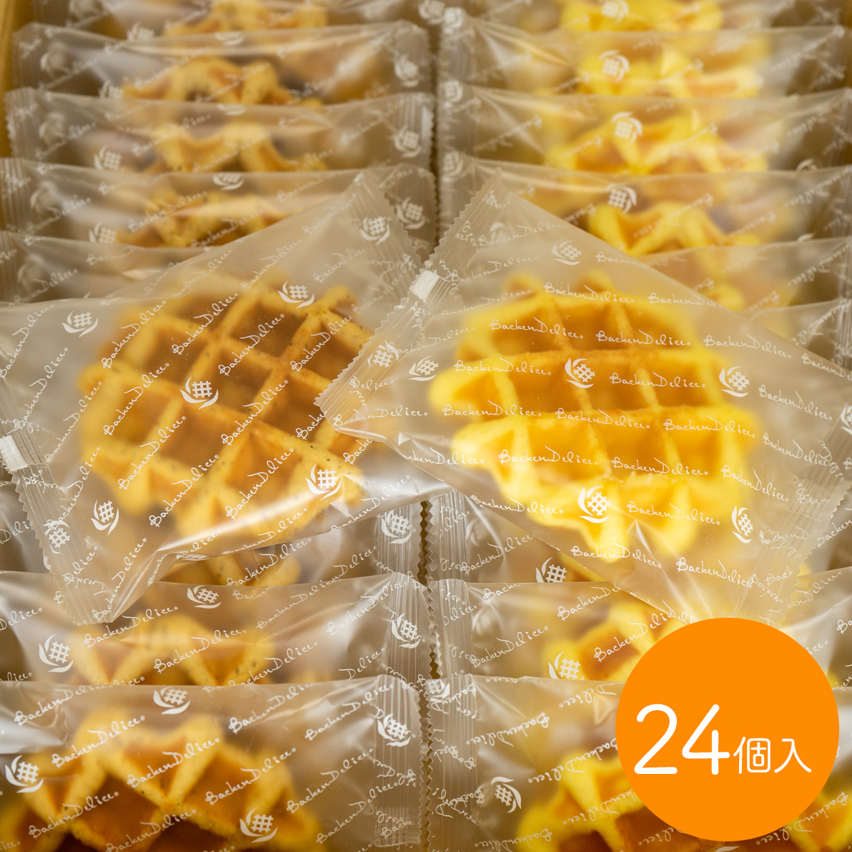 直径約9cm、1個約42gのワッフル、たっぷり24個入り!定番のプレーン味と味わい香るロイヤルミルクティー味。日持ちもするので、買い置きに最適。