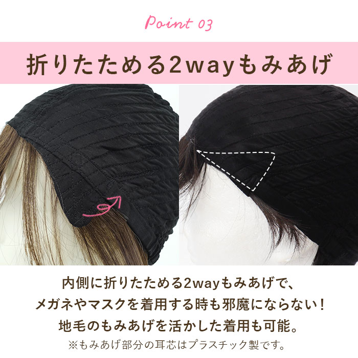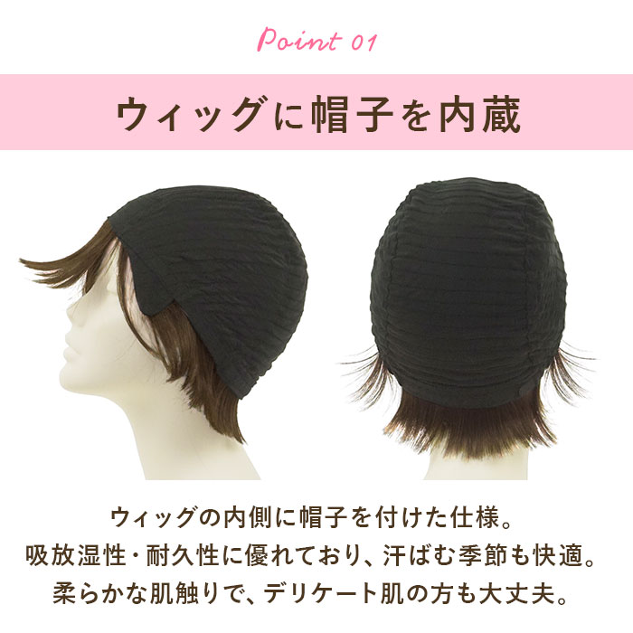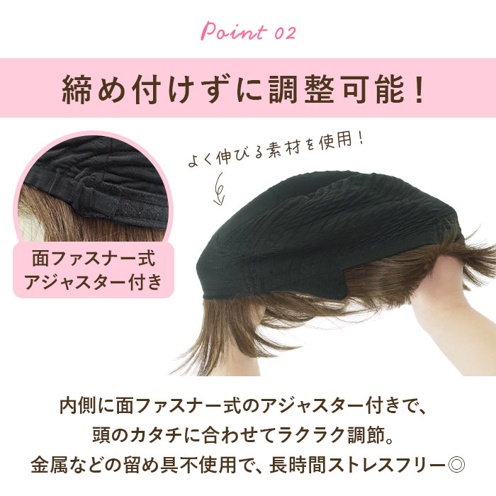 | ・帽子をかぶるようにウィッグをかぶって、外ハネボブヘアに♪誰でも簡単装着できる、帽子ウィッグが登場。 【憧れのヘアスタイルにチェンジ】 ・メリハリのあるシルエットをつくる、外ハネボブヘアに変身☆ゆったり感のあるサイズで、ちょっとしたお出かけやリラックスタイムにも! 【ウィッグに帽子を内蔵】 ・ウィッグの内側に帽子を付けた仕様。伸縮性に優れているから締めつけ感を感じにくく、長時間の着用もストレスフリー◎ 【キャップは天然素材】 ・キャップには土に還るエコ素材を採用。吸放湿性・耐久性に優れており、汗ばむ季節も快適。柔らかな肌触りで、デリケート肌の方も大丈夫。 【着脱がカンタン】 ・内側の帽子を持ってウィッグをかぶり、自分のこめかみやつむじの位置と合わせてスタイリングするだけ。ロングヘアの方は、付属のオールウィッグネットを使用。 【自分サイズにフィット】 ・内側に面ファスナー式のアジャスター付きで、頭のカタチに合わせてラクラク調節。金属などの留め具不使用で、頭皮に負担がかからないのもポイント。 【2wayもみあげ】 ・内側に折りたためる2wayもみあげで、メガネやマスクを着用する時も邪魔にならない!地毛がショートヘアの方は、地毛のもみあげを活かした着用も可能。 【自然なつむじ】 ・人工スキン部分は、より本物に近い頭皮の質感を表現!真上から見られても、ウィッグだと気づかれにくく安心。 【ナローミックスファイバー】 ・従来の新ファイバーに細いファイバーをミックス!より人毛に近い質感を再現することで、ウィッグに見えないナチュラルな仕上がりに。 【日本製耐熱ファイバー100%】 ・コテやヘアアイロンの使用もOK。お好みに合わせてアレンジできるのが嬉しい! 【お手入れラクラク】 ・絡みや汚れが気になったら手洗いできるから、いつも清潔。 【ウィッグ初心者さんでも安心】 ・着用ポイントなどが書かれた説明書、持ち運びに便利なクリアポーチが付属。 【使い方いろいろ】 ・おしゃれを楽しむアイテムとしてはもちろん、医療用としても活躍。 |