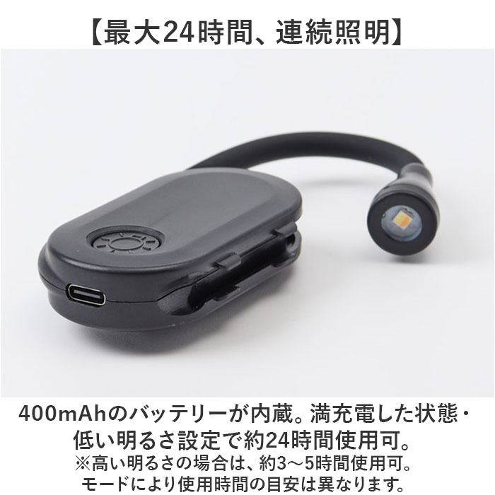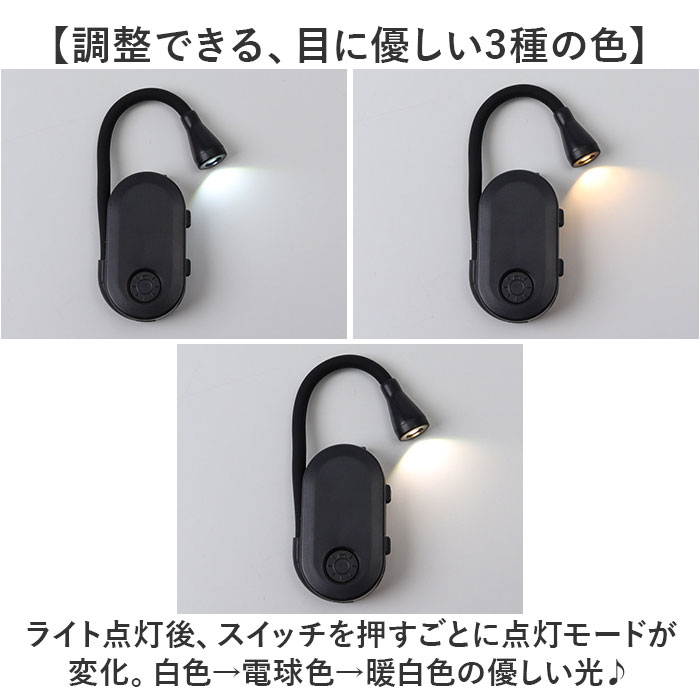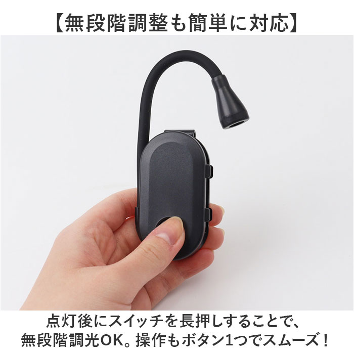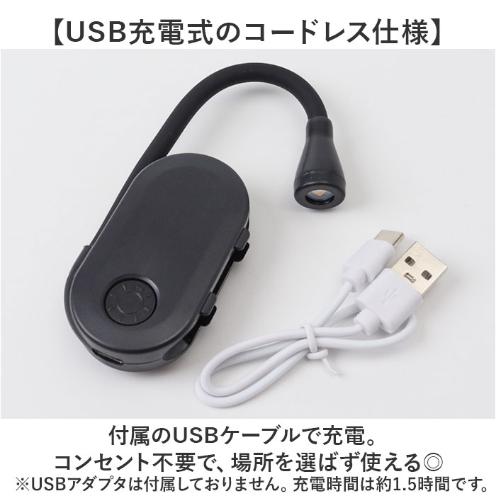 | 【本に挟んで使える便利アイテム】 ・読書や勉強、手芸などに最適◎手元を照らしてくれる「クリップオンブックライト」。 【本体とクリップが一体化!】 ・本や薄い生地に挟むことができるミニライト。アームが360度曲がり、お好みの角度に調節。 【置くこともできる両用タイプ】 ・デスクに置いて使用することも可能。シーンに合わせて使い分けできるのが嬉しい◎ 【調整できる、目に優しい3種の色】 ・ライト点灯後、スイッチを押すごとに点灯モードが変化。白色→電球色→暖白色の優しい光♪ 【無段階調整も簡単に対応】 ・点灯後にスイッチを長押しすることで、無段階調光OK。操作もボタン1つでスムーズ! 【最大24時間、連続照明】 ・400mAhのバッテリーが内蔵。満充電した状態・低い明るさ設定で約24時間使用可。 (※1)高い明るさの場合は、約3〜5時間使用可。モードにより使用時間の目安は異なります。 【USB充電式のコードレス仕様】 ・付属のUSBケーブルで充電。コンセント不要で、場所を選ばず使えるのがポイント。 (※2)USBアダプタは付属しておりません。充電時間は約1.5時間です。 【どこへでも手軽に持ち運べて万能】 ・ポケットやミニポーチに収まるコンパクト設計。旅行や出張などのお供にもおすすめ! |