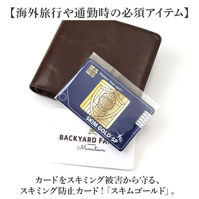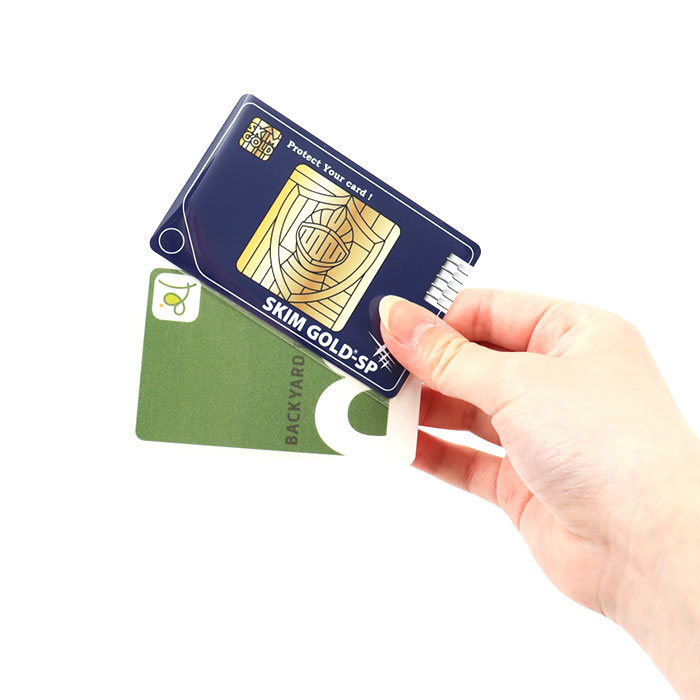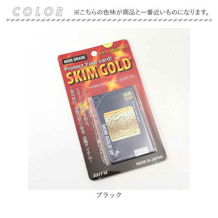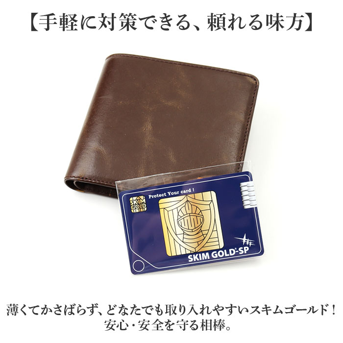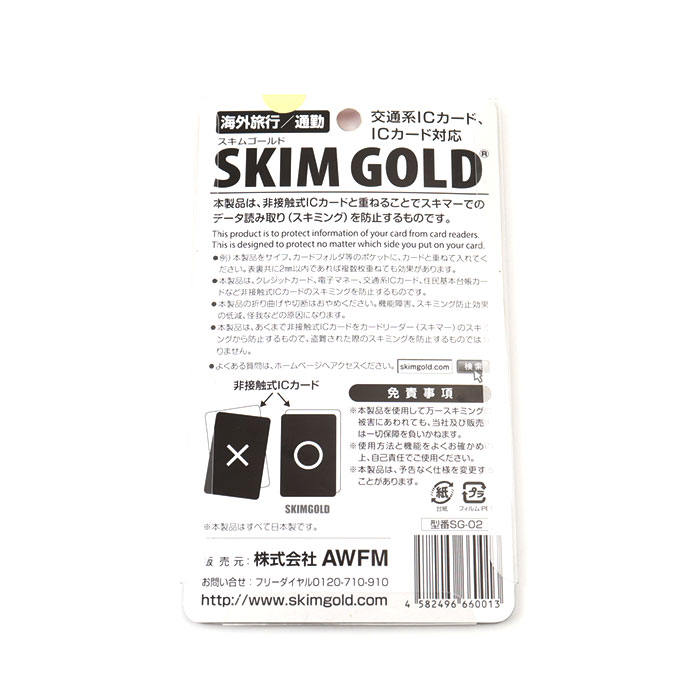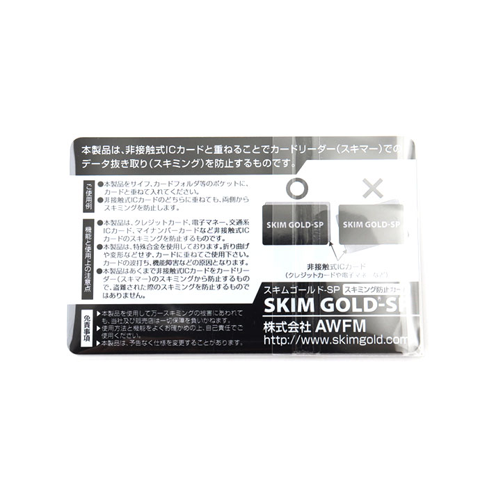 | 【海外旅行や通勤時の必須アイテム】 ・カードをスキミング被害から守る、スキミング防止カード!「スキムゴールド」。 【重ねるだけで個人情報をガード】 ・お手持ちのカードと重ねて、財布などに入れておくだけ。カード情報を99.9%防御! (※1)表裏ともに2mm以内であれば、複数枚重ねても効果があります。 【画期的なフィルムで高い防御能力】 ・電波を反射する機能と吸収する機能をあわせ持ち、有害電磁波や電波からも人体を守るフィルム◎ (※2)非接触式ICカードをカードリーダーのスキミングから防止するもので、盗難された際のスキミングを防止するものではありません。 【手軽に対策できる、頼れる味方】 ・薄くてかさばらず、どなたでも取り入れやすいスキムゴールド!安心・安全を守る相棒。 |