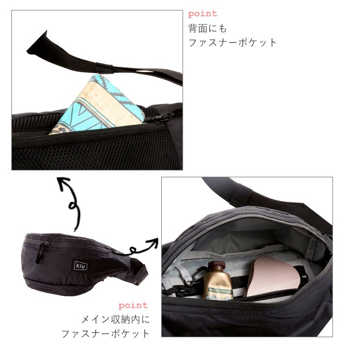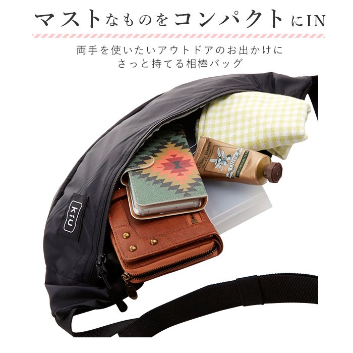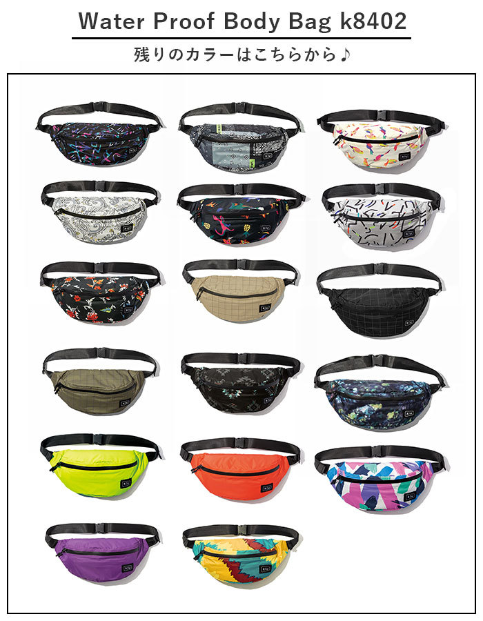 | ユニセックスで使えるウォータープルーフ仕様のボディバッグです。生地に防水・はっ水加工を施しているので、海や山のレジャーに大活躍!急な雨にも対応できます。止水ファスナー付きで、水が浸入しにくいのも嬉しいですね。 メイン×1、背面ポケット×1、内側ポッケト×2、メッシュポケット×1があり、小物整理もできます。また、内側にカラビナ付きなので、無くなりやすい鍵なども安全に保管できます。 |