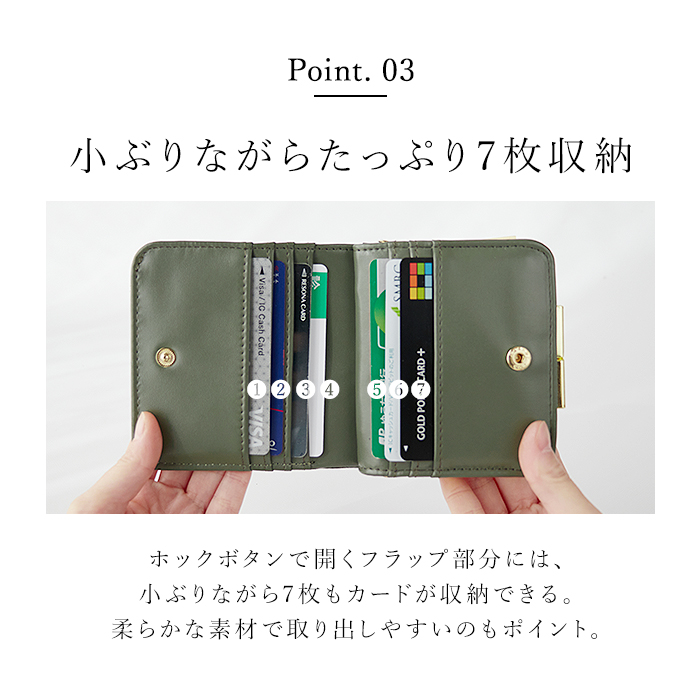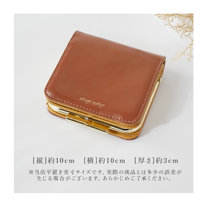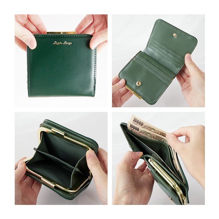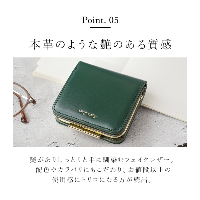 | ・艶やかな輝きが美しい。人気のシャイニーフェイクレザーシリーズに、コンパクトながま口型二つ折り財布が新登場。 ・がま口型小銭入れ部分には、鏡面のような光沢のあるゴールド色の金具を使用して、クラシックな雰囲気と女性らしいエレガントさが共存したデザイン。 ・小銭入れ部分はポケットが二つに分かれていて、コインを分けて収納しやすい♪がま口が大きく開いて中身が見やすいのも嬉しい。 ・ホックボタンで開くフラップ部分には、たっぷり7枚のカードポケット付き!整理を怠ってしまいがちなカードもすっきり収納できる。 ・単一カラーのベーシックなフォルムに、Legato Largoのロゴが小さく控え目に箔押しされたシンプルなデザインで、大人女子の落ち着いた雰囲気にマッチするアイテム。 |