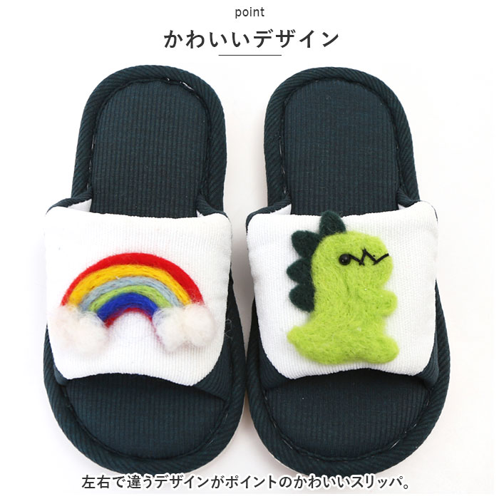 | ・さらっとした肌触りが気持ちいい♪オールシーズン使えるこどもスリッパ。 【かわいいデザイン】 ・左右で違うデザインがポイントのかわいいスリッパ。 【快適インソール】 ・クッション性のあるインソールはフィット感があり優しい履き心地。 【滑りにくいPVCアウトソール】 ・スリッパ底面にはしっかりと溝の刻まれたPVCアウトソールを採用。 【リンクコーデも自在!】 ・幅広いサイズ展開で、兄弟・姉妹でお揃いにしても可愛い! |