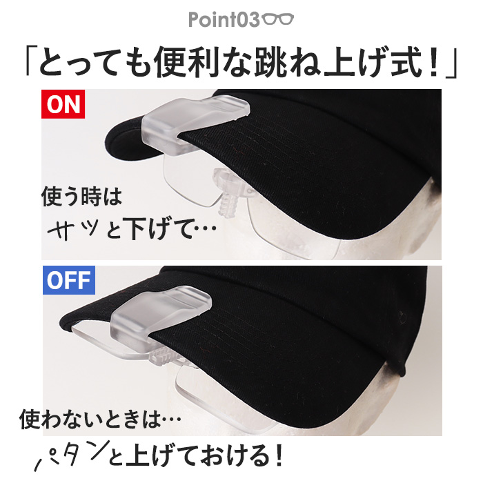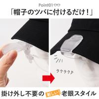 | 【帽子に装着できる老眼鏡!】 ・外でも、買い物中でも、サッと見える「冒険王 老眼屋 ネオキャップシニア」が登場。 【両手が自由に使える老眼サポート】 ・帽子のツバにワンタッチで装着!ポケットもバッグもかさばらない新しい老眼スタイル。 【新型ギアクリップでフィット感UP!】 ・角度も距離も自分好みに調整OK。見たいものにピタリと合う快適な視界。 【跳ね上げ式でサッとON・OFF】 ・使わないときはパタンと上げておけるから、見た目すっきり。外出時にも安心♪ 【前後スライド設計で手元ラクラク】 ・細かな文字も、値札も、地図もくっきり。お出かけ先でもストレスフリー。 【重さゼロ感覚の軽やか装着】 ・帽子と一体だからズレ知らず!装着していることを忘れる軽やかさ。 【持ち歩きやすいコンパクトサイズ】 ・ポケットにもすっと収まり携帯性も◎ 【見え方に合わせて選べる4段階】 ・+1.50、+2.00、+2.50、+3.00の4段階。目の状態に合わせて選べる安心のラインナップ。 【シンプルデザインで男女兼用】 ・どんな帽子にもなじむナチュラル仕様。ご夫婦でシェアもおすすめ。 |