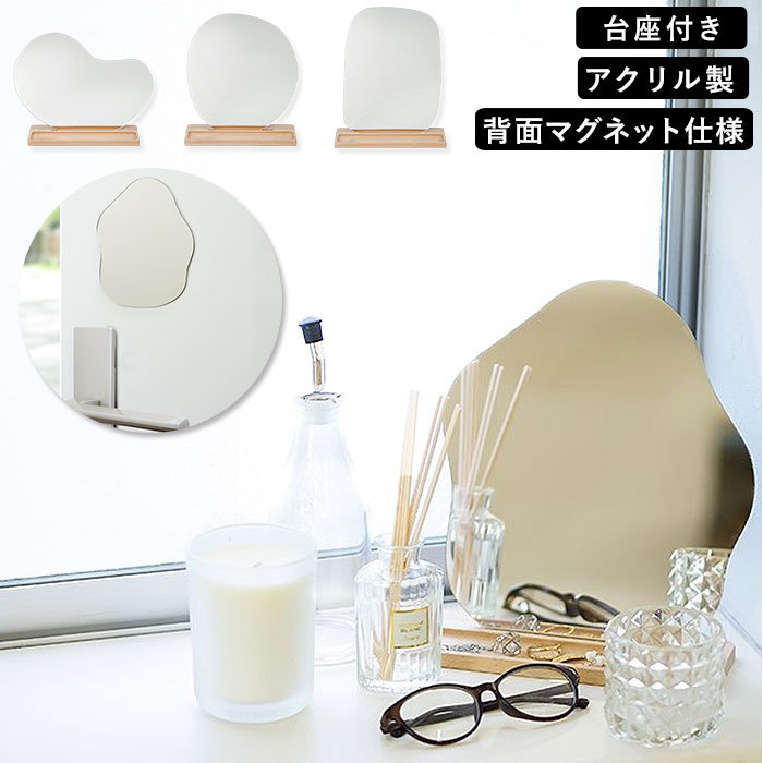 | 【ミラーサイズ】 ・みずたまり [縦]約24cm/[横]約21cm/[厚み]約0.25cm ・そらまめ [縦]約21cm/[横]約約24cm/[厚み]約0.25cm ・しかく [縦]約24cm/[横]約17.5cm/[厚み]約0.25cm ・まる [縦]約22.5cm/[横]約20cm/[厚み]約0.25cm 【台座サイズ】(共通) [縦]約1cm/[横]20cm/[奥行]7cm ※種類によりサイズは異なります ※サイズは当店計測の実寸サイズです。実際の商品ならびにメーカー表記サイズとは多少の誤差が生じる場合がございます。あらかじめご了承ください。 |