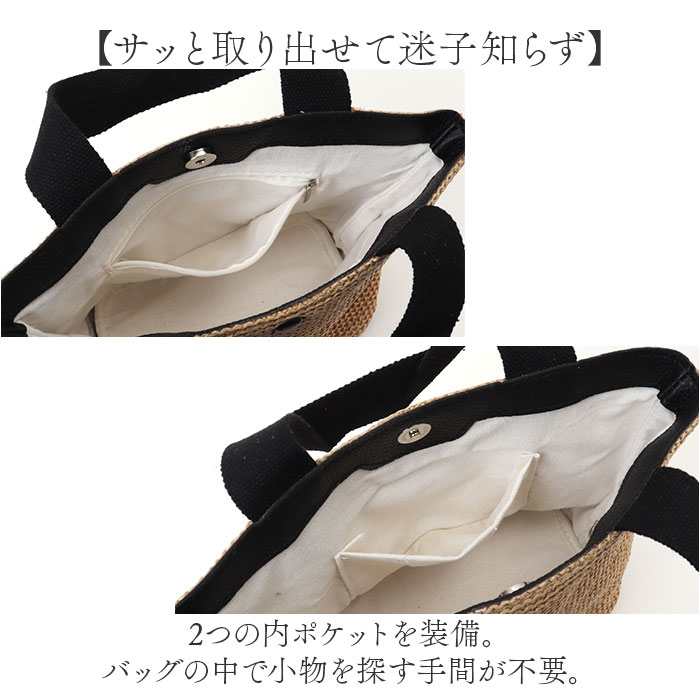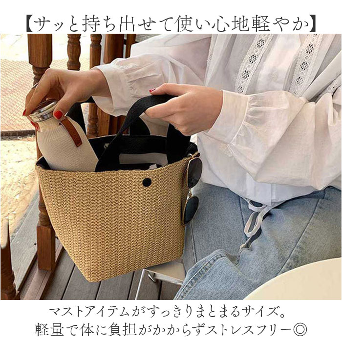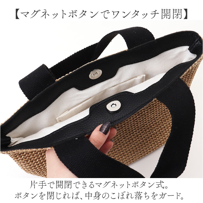 | 【涼しげで春夏にぴったり】 ・ナチュラル感たっぷり。季節感のあるコーデが叶う「カゴバッグ」が新登場。 【サッと持ち出せて使い心地軽やか】 ・マストアイテムがすっきりまとまるサイズ。軽量で体に負担がかからずストレスフリー◎ 【マグネットボタンでワンタッチ開閉】 ・片手で開閉できるマグネットボタン式。ボタンを閉じれば、中身のこぼれ落ちをガード。 【長財布もペットボトルもOK】 ・長財布や500mlペットボトルが横向きに。程良いマチ設計で、ミニポーチなどもIN。 【底板を使って安定感をプラス】 ・取り外し可能な底板付き。荷物を安定した状態で持ち運び! 【サッと取り出せて迷子知らず】 ・2つの内ポケットを装備。バッグの中で小物を探す手間が不要。 【コーデを選ばないナチュラル感】 ・落ち着きのあるデザインで、カジュアルにもキレイめにも素敵にマッチ。 【ポケット仕様】 ・内側:オープンポケット×1、ファスナーポケット×1 |