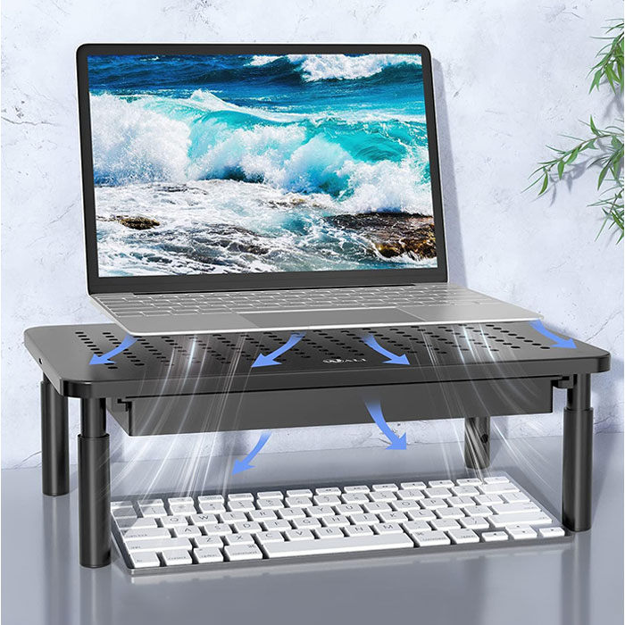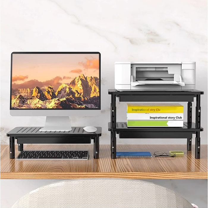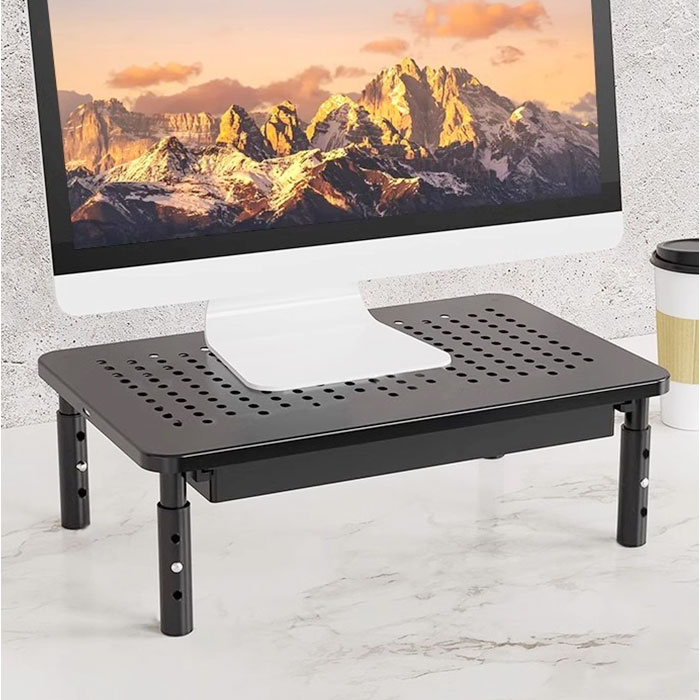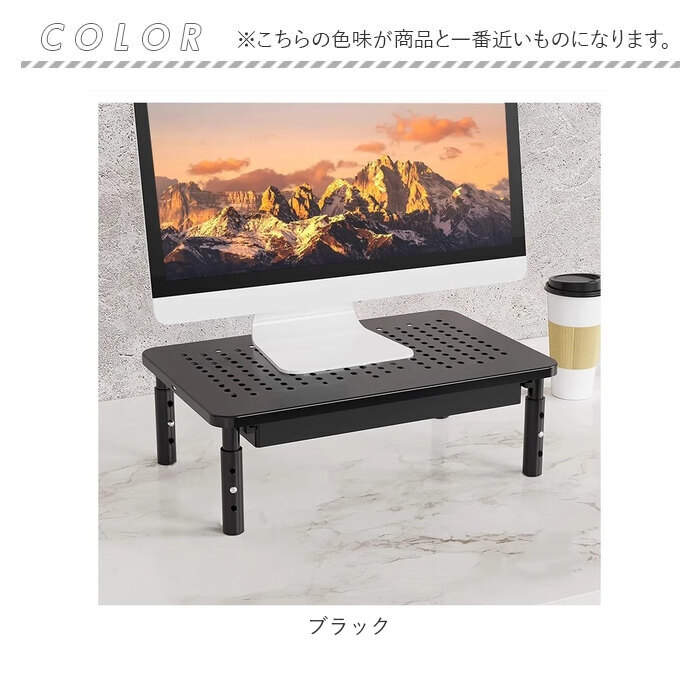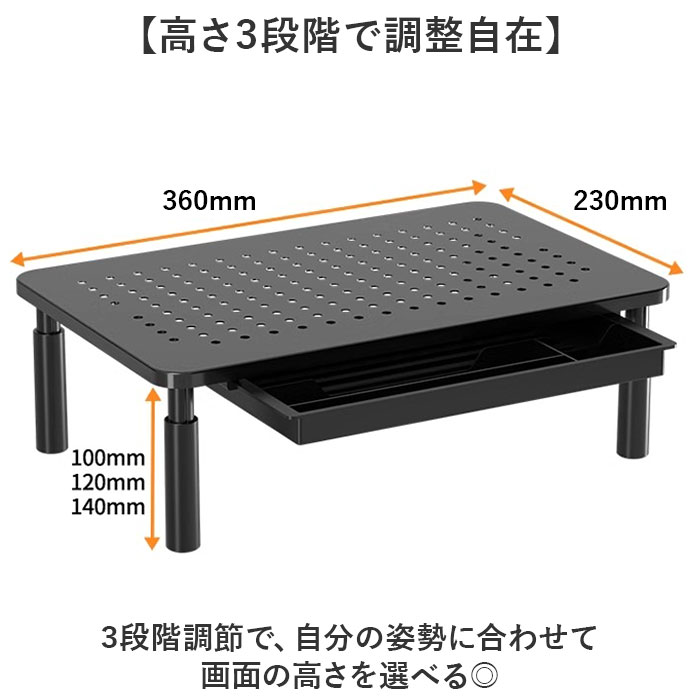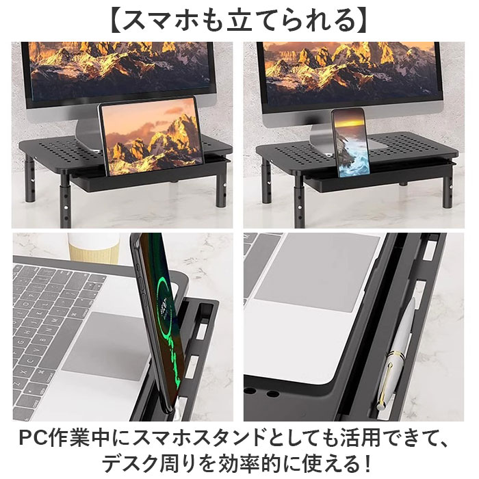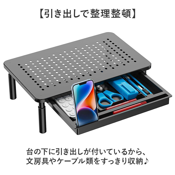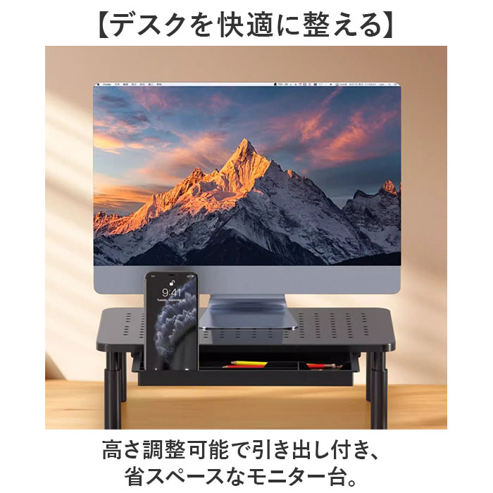 | 【デスクを快適に整える】 ・高さ調整可能で引き出し付き、省スペースなモニター台。 【高さ3段階で調整自在】 3段階調節で、自分の姿勢に合わせて画面の高さを選べる◎ 【引き出しで整理整頓】 ・台の下に引き出しが付いているから、文房具やケーブル類をすっきり収納♪ 【放熱しやすい穴あき】 ・天板に通気穴があるから、モニターやノートPCの熱を逃がして快適に使い続けられる〇 【スマホも立てられる】 ・PC作業中にスマホスタンドとしても活用できて、デスク周りを効率的に使える! 【アルミ合金の質感】 ・脚を回して取り付けるだけで簡単に組み立てられる。 |