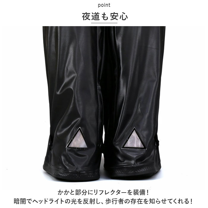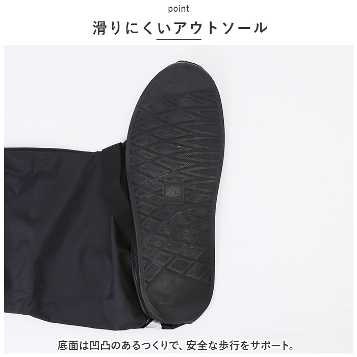 | ・雨の日に大活躍!水滴や汚れから足元を守る、ロングタイプのシューズカバーが新登場。 【長靴のような安心感!】 ・履いている靴の上にサッと被せて装着!つま先から膝下までしっかりカバーできるのが嬉しい☆ 【雨の侵入を軽減】 ・水滴や汚れをサッと弾きやすい素材を使用。内側サイドのファスナー部分はカバー付きで、雨が内部に入りにくい!(※完全防水ではありません。) 【ストレスフリーな履き心地】 ・履き口はゴム仕様&スナップボタン付き。締め付けることなく心地よいフィット感◎ 【安定感をプラス】 ・甲部分を伸縮性のあるスナップボタン式ゴムベルトで固定!緩みにくく、脱げにくいのがポイント。 【夜道も安心】 ・かかと部分にリフレクターを装備!暗闇でヘッドライトの光を反射し、歩行者の存在を知らせてくれる! 【滑りにくいアウトソール】 ・底面は凹凸のあるつくりで、安全な歩行をサポート。 【色んなシーンで】 ・雨の日の通勤・通学、お出かけにはもちろん、アウトドアやガーデニング作業時にも!折りたたんでスリムに持ち運びOK。 |