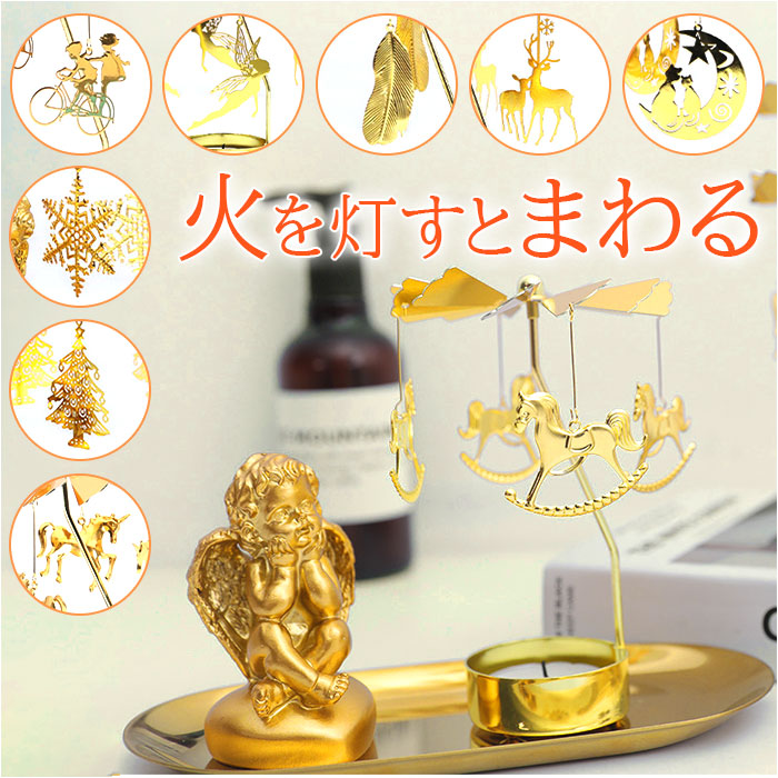 | ・キャンドルを灯すと回転するロータリーキャンドルホルダーが登場! 【キラキラと回転】 ・火を灯すと飾りがくるくると回り、光を反射しキラキラと周囲を照らしておしゃれな印象に。(※ティーライトキャンドル付き) 【インテリアとして】 ・ゴールドカラーのプレートと天使の置物付きで高級感があり、エレガントな雰囲気を醸し出し、インテリアとしても◎ 【くつろぎタイム】 ・キャンドルの炎と繊細なモチーフがくるくると回る様は気分を落ち着かせ、くつろぎの時間がさらに楽しみに! 【ギフトにぴったり】 ・お誕生日や、母の日、ちょっとしたお祝い事などにプチギフトとしてピッタリ! |