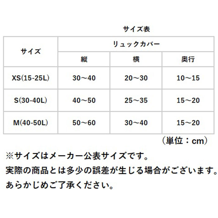 | ・XS(15-25L) ・S(30-40L) ・M(40-50L) ※サイズについて詳細は、商品画像の中にあるサイズ表をご覧くださいませ。 |