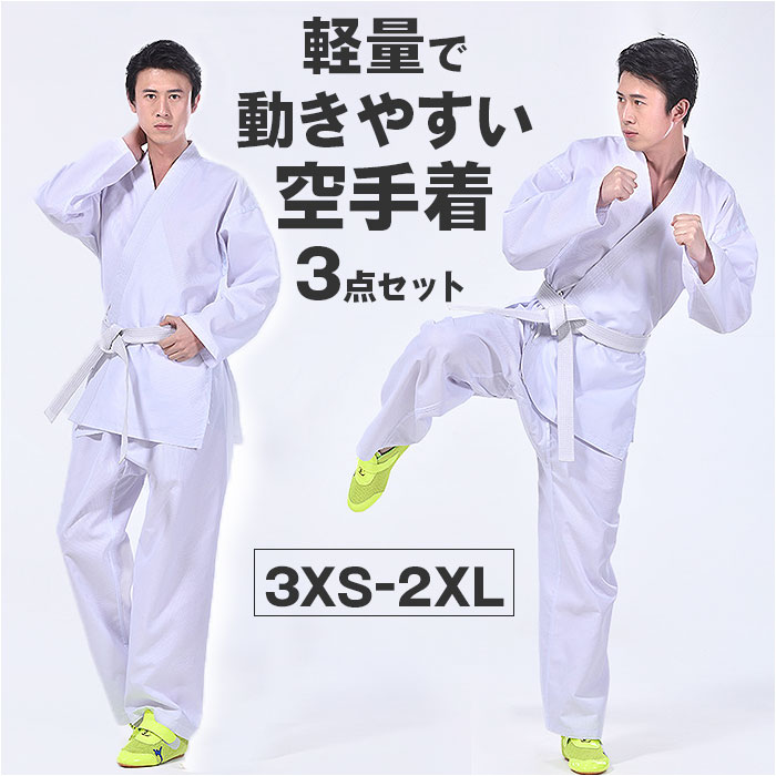 空手着 3点セット 初心者用 通販 空手 道着 空手衣 胴衣 上下 帯セット 白帯 上着 上衣 パンツ 子供 大人 軽量 速乾 腰ゴム 動きやすい コットン