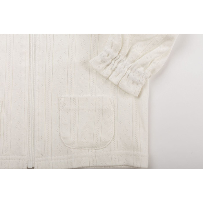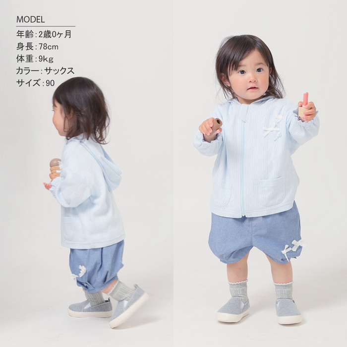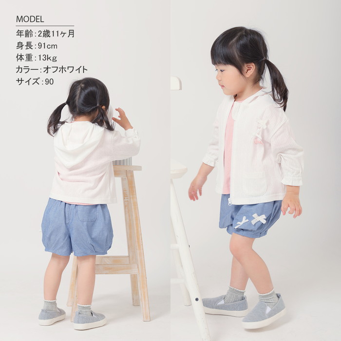 | ・針抜きで模様を表現したパターンメッシュ素材がかわいい ・綿100%なので、吸汗性が良く汗ばむ季節にも快適な着心地 ・前開きで着脱も簡単! ・ファスナー上部にガードがついており、安心して着用可能! ・薄手の羽織なので、冷房対策、日焼け虫よけ予防にも◎ |