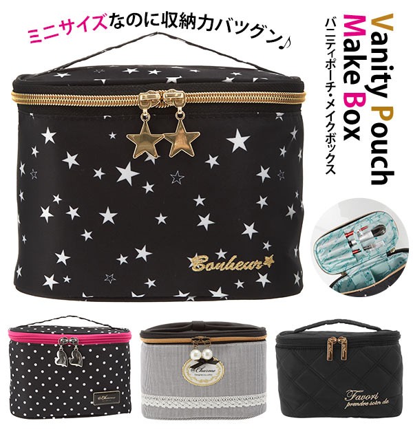 | 大人気のおしゃれでかわいいメイクボックス、バニティポーチです。 コンパクトで軽量なのに、使い勝手バツグン。お気に入りのメイク用品をコンパクトに収納できます。便利な仕切り板は、マジックテープ仕様。中身に合わせて、スペースを調整できます。 ポケットやブラシ入れも付いて、とっても便利です。仕切り板のブラシ入れは、メイクブラシがスムーズに入るようにバイアスが下部分にあります。 フタ裏部分にもブラシ入れがあり、透明カバー付きで汚れを防ぎます。 |